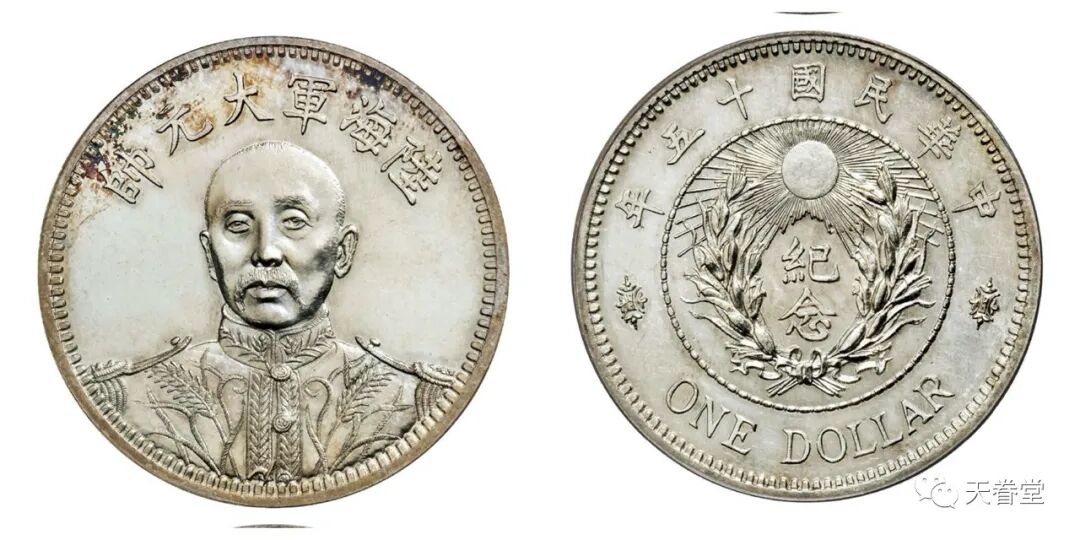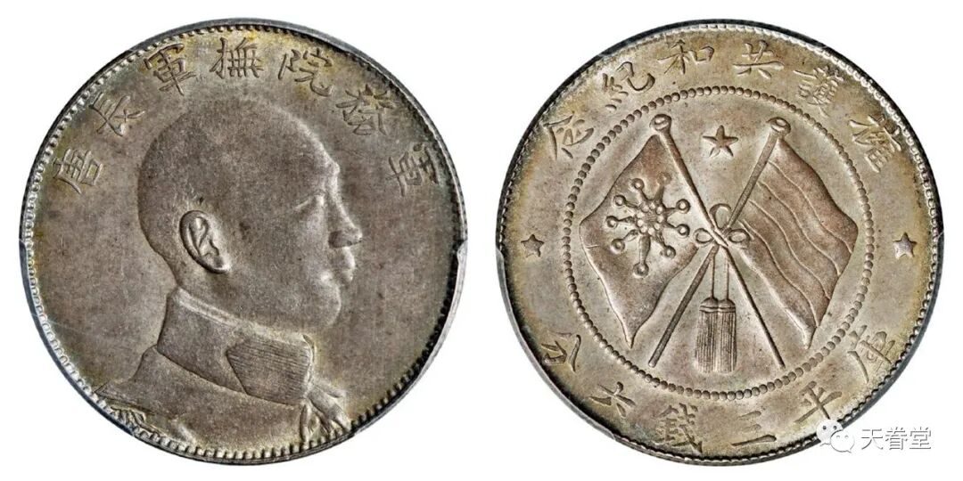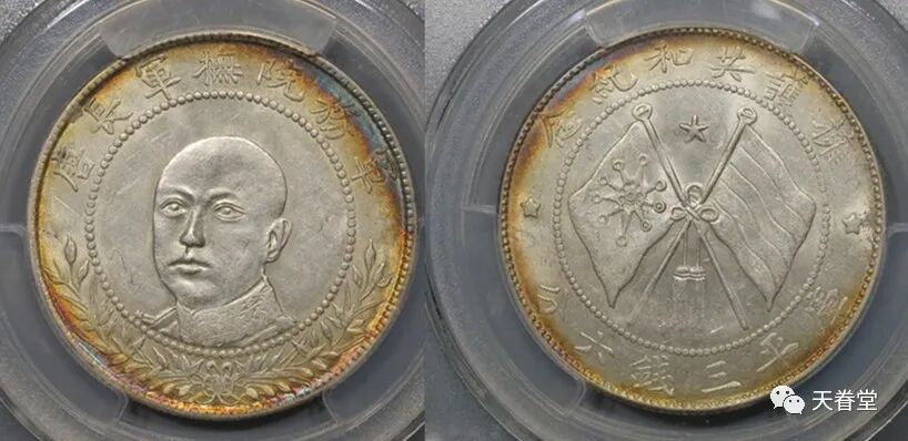 1916年唐继尧侧面像拥护共和纪念库平三钱六分,五彩光泽,品相难得,PCGS MS64+,目前该公司评级纪录中,仅一枚与之并列最高分。北京诚轩1265000元