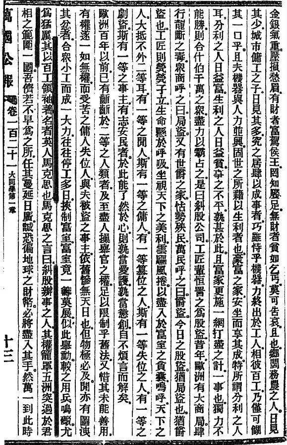 开《共产党宣言》译介先河者,当属《万国公报》。1889年,复刊后的《万国公报》,由周刊改为月刊,开始刊登欧美流行的社会主义学说。该报于1899年的第121册至第124册,登载了《大同学》,暗示消除社会分裂,必须要借助宗教力量。在“今世景象”段落中,《大同学》首次提到了马克思,并引用了《共产党宣言》的文字,“纠股办事之人,其权笼罩五洲,突过于君相之范围一国”,其现代通行译文则是“资产阶级,由于开拓了国际市场,使一切国家的生产和消费都成为世界性的了”。