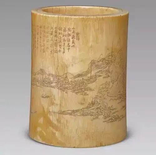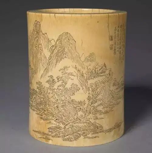 圆体,器口壁厚而足壁薄,后嵌底。器身表面以阴刻法描绘山林溪岸景色,并填涂黑色。构图完整,徐徐铺展,人无面目,室无窗棂,似意笔草草,却深合画理。刻线短促有力,下刀爽利快捷,又不失表现力,颇有枯笔皴擦的效果,风格雅洁脱俗,实为同时期牙雕笔筒中所不多见。上部阴刻行书题跋 :“山色巍峨丹碧鲜,结为寒气融为泉。生平游迹遍吴楚,好山过眼心悬悬。偶然笔写气象千,林木深深在眼前。幽秀寄庐无人迹,看山终日如坐禅。当门老松藏古拙,青溪白石皆云填。案头留别笔墨缘,祝君之颜如同年。”并“乙卯春三月,往清华,道经旧友,至村前,苍松古柏,深涧西流,野草奇花,为高人隐寄,行于庄内。茅屋数间,琴童一二,询其主人,言之在室,随拜仿而获面,相别多年,今幸握晤。忽见案头立一文俱(具),颇为古雅,未作文字,信手挥成,未得深趣,留为志老道兄存记也。墨井道人渔山吴历。”前有“墨井”引首章,后有“渔”“山”二印。