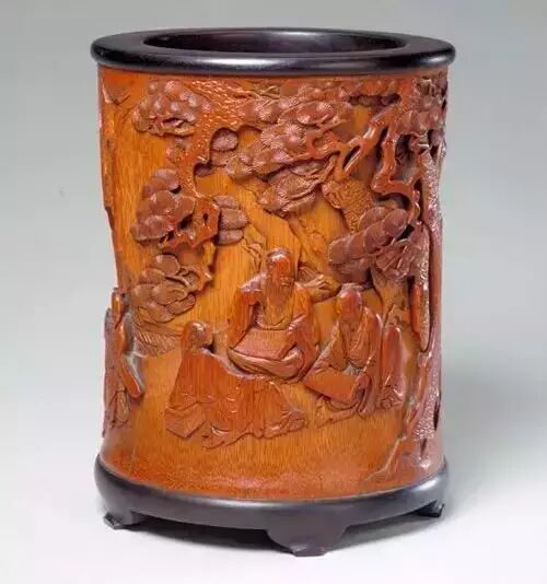 竹雕文具作为士大夫之清玩,或以传世名画为粉本。此器上的倚松高士,与五代周文矩《文苑图》中所绘者虽衣冠有别而姿态无二。围坐三人执笔伸卷的活动亦与画中人物相似,应是受原作启发、重新构图的结果。此器以高浮雕技法雕成,人物、景物刻画细腻。通过竹表、竹肌的不同色泽和纹理,恰如其分地表现出景物的层次,为作品增添艺术感。(刘思桐)