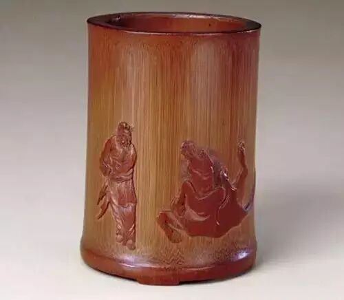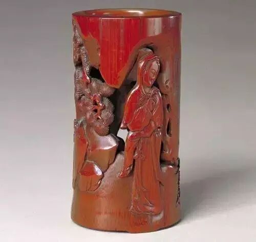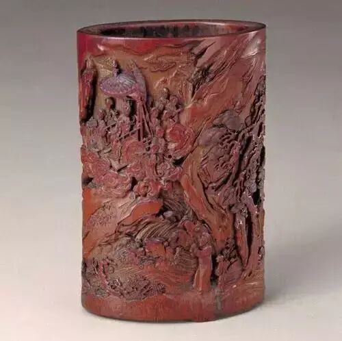 此器于阴刻中施以高浮雕和镂雕,既保证了纹饰的层次感和空间感,又收到似阴实阳、阴中有阳的特殊装饰效果,凹凸变化精微。而剔刻后竹肌的色泽与深红的表色相得益彰,更显示出其高超的技巧和雅致的格调。(刘岳)