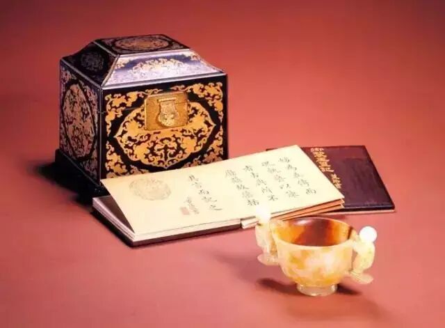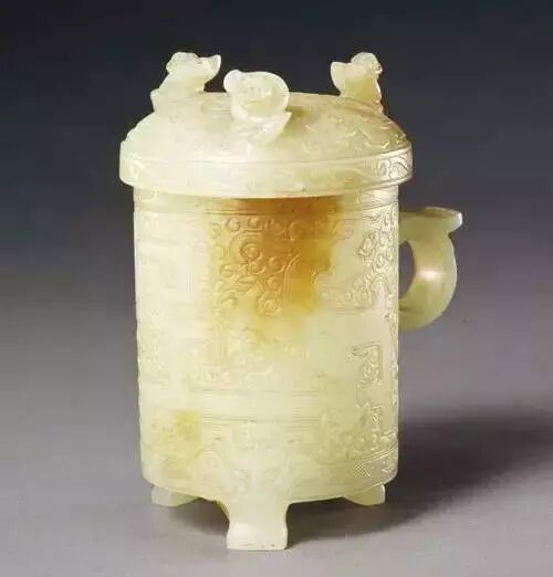 此杯因工艺精湛,做旧也十分到位,使乾隆皇帝莫辨真假,以为汉代之物,叫来造办处的苏州籍玉工姚宗仁加以询问,宗仁笑曰 :此乃其祖父所做的伪古之器,用了一种家传的琥珀染色做旧秘法,经年才成。其祖父为康熙年间苏州玉工,故此杯当成于康熙之时。乾隆听后大为称奇,并以此杯制作精到,写下《玉杯记》一文,制成册页,与玉杯及所配的檀香木座、黑漆描金漆盒一起传之后世。(徐琳)