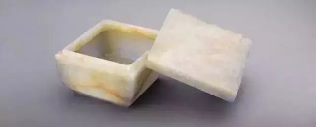 青白玉,玉质温润。盒盖子母口,盖上以浅浮雕及阴线刻的手法雕琢山水人物。远山近水,一棵垂柳下坐两人,对坐交谈,远处渔舟,一人在船头垂钓,另有茅屋、山人,俨若山水画页,一边浮雕诗句 :“桃红含宿雨,柳绿带朝烟。”盒身及盖四壁以过枝技法浅浮雕秋葵、荷花、石榴、桃花,代表一年四季。盒底方框内,减地浮雕“子冈”两字。(徐琳)