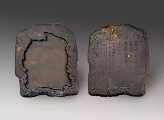 大略为方形,随形不规则。受墨处光滑平阔,无墨池。面上有石质缝隙,有眼若干。边缘凸起,工匠利用一椭圆眼,在边缘雕刻凤鸟一只,翅膀羽毛环绕砚面一周,并流云纹。羽毛纹理清晰可见,动感十足。鸟头俯视升空环抱。侧面有竖行阴文篆书“顾二娘造”款。砚背四周亦为羽毛,流云纹装饰,浅浮雕,中间为辛丑年(康熙六十年,1721 年)黄任铭,砚附木盒。