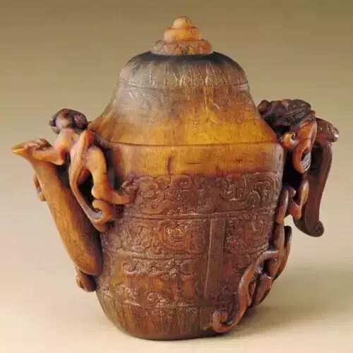 此器以一只较大犀角截去角尖制成壶身,一较小犀角保留原形制成壶盖,加之流、把俱全,突破了常见的犀角杯形制,构思奇巧,有先声夺人之妙。壶身用极浅的阳文浮雕配合阴刻技法,模仿商周青铜器的装饰,雕刻出主体双层纹样 :雷纹地上以简化扉棱为鼻左右对称的兽面,相向夔纹则似为眉部 ;其上一周又饰以夔龙、夔凤,其下一周饰蕉叶纹。盖上纹饰相近,亦饰蕉叶与夔纹。在壶的流及把上,还分别镂雕螭纹,蜿蜒攀爬,姿态生动。壶底刻剔地阳文“鲍天成制”篆书印章。