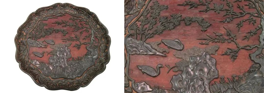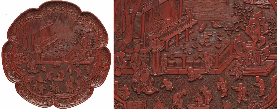 元 剔红仕女婴戏图花瓣形盘