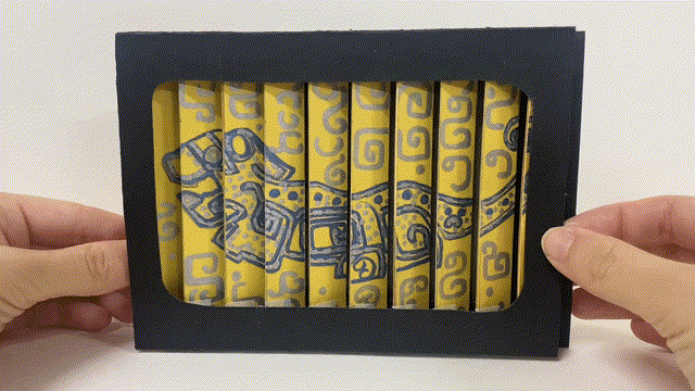 粘好后,整体翻转画面,出现另一面镜像的玉虎。将翻转后的画面上下两端依次和另一张相框粘合。