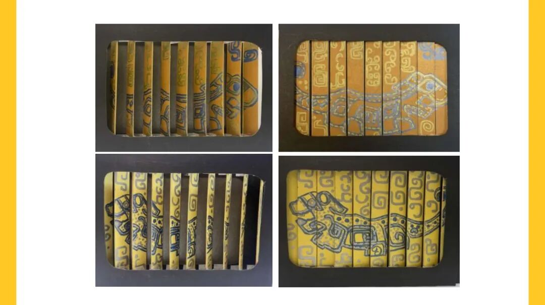 将画好玉虎的卡纸定位在相框底板上,距相框左侧边缘0.5cm;依次整齐排列裁开的画面,用美纹胶带将两端一条一条地与相框进行粘合。
