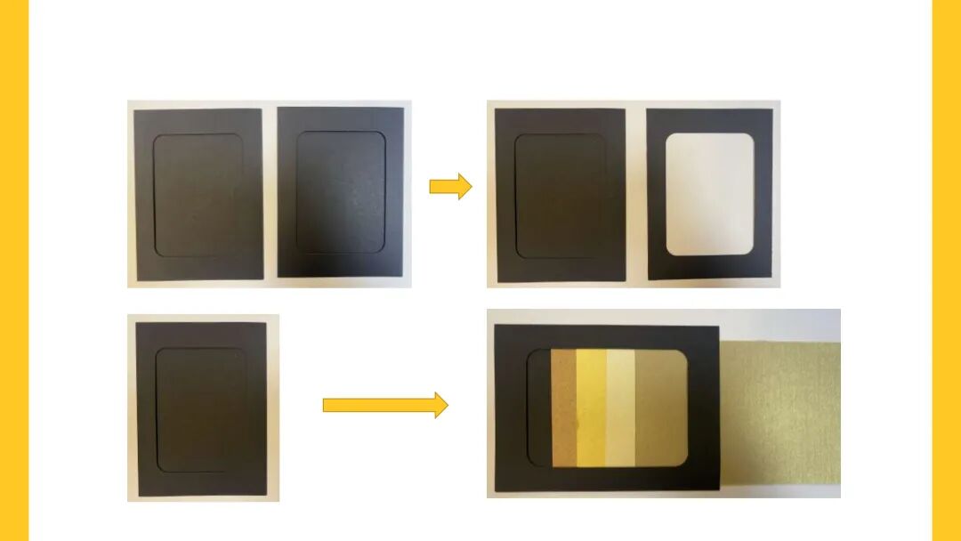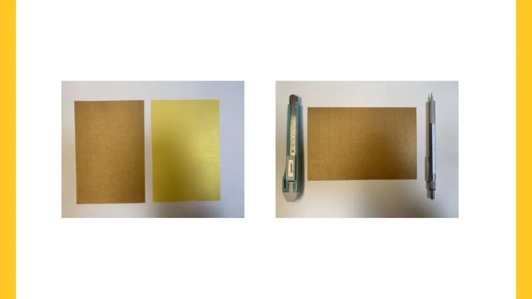 为了可以正反面取景,将选定的两张彩色卡纸裁成与画框同等大小,并将这两张卡纸粘合在一起。在彩色卡纸上标记1.5cm宽度的间隔符号(为了视觉效果,间隔宽度不宜太窄),为之后裁剪做准备。