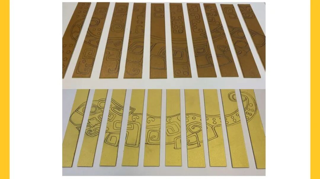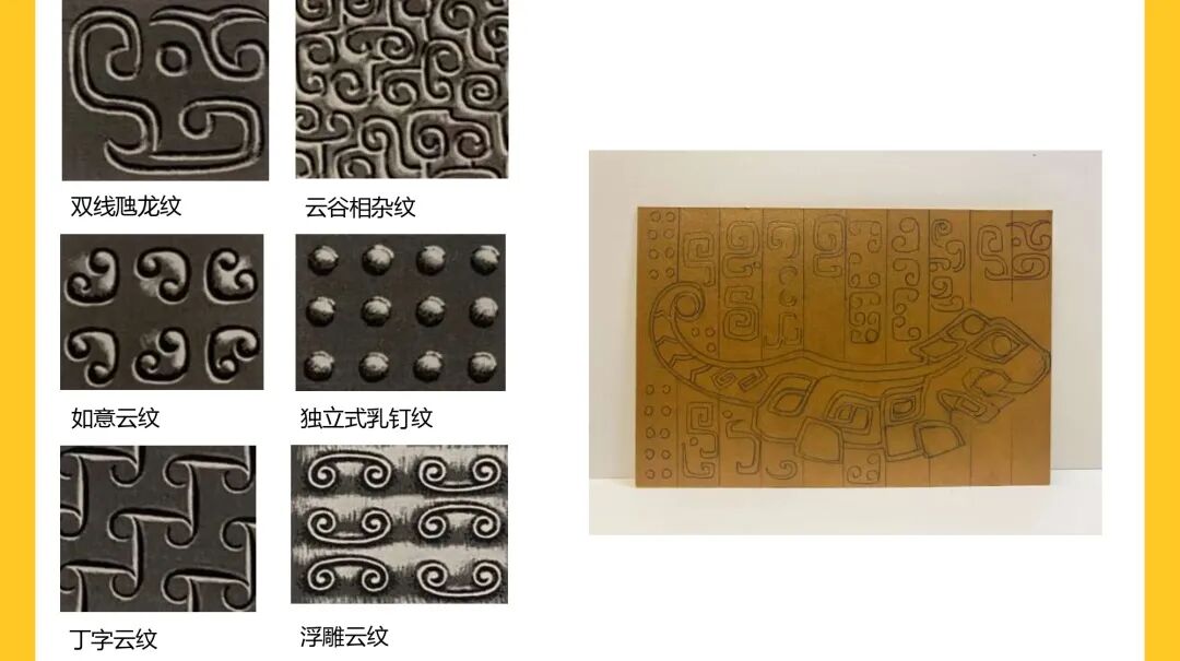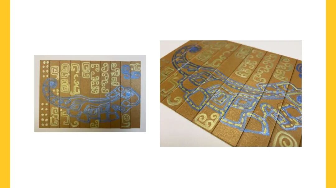 为了加强作品美感及视觉效果,可借鉴古代玉器常见纹样,对画面背景进行装饰。底稿完成后,利用彩色珠光笔,选取自己喜欢的颜色进行勾画。