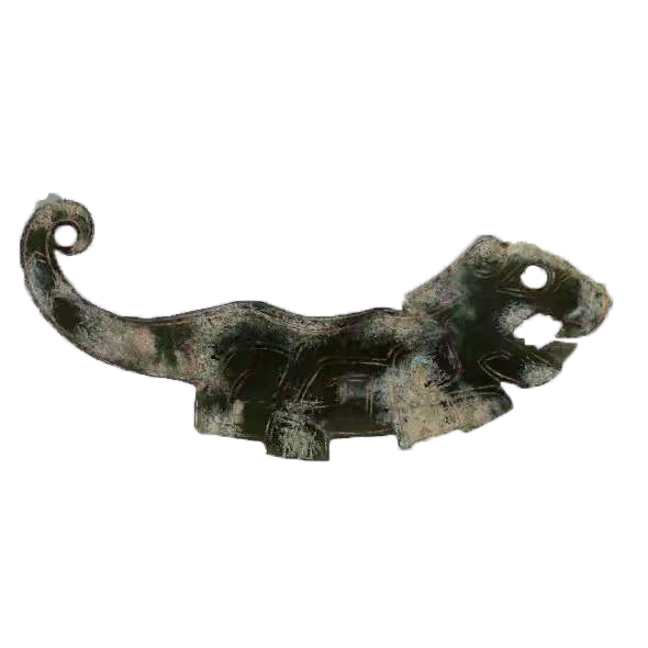 此件馆藏商代晚期的玉虎,口微张,足部蹬地,尾部上翘并蜷曲,奔跑之状颇为生动。商代玉器的特征,也鲜明地体现在这只小玉虎上。