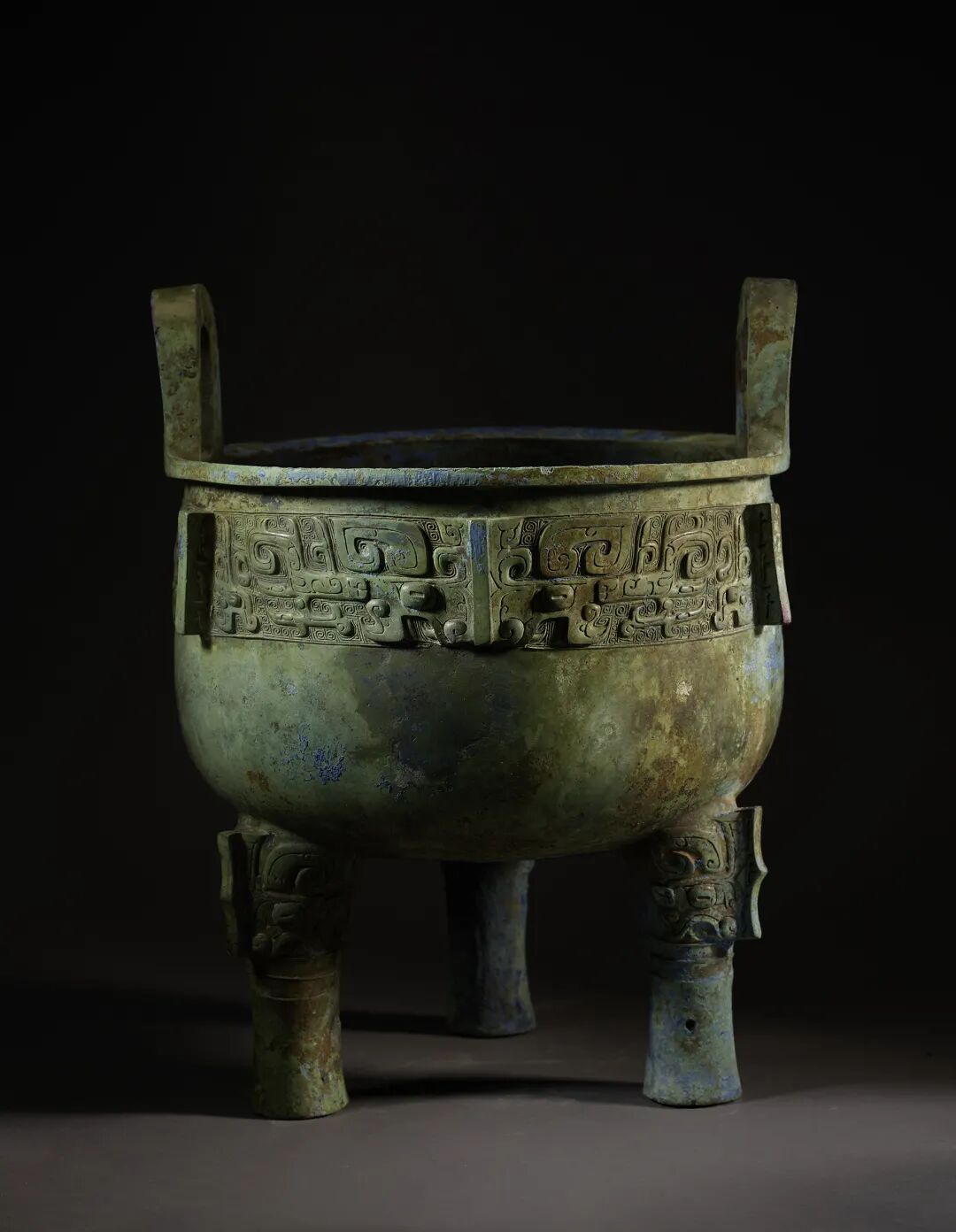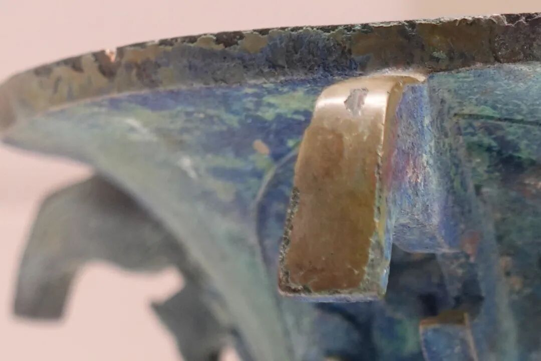 其实,青铜器的本色应为金色,故而古代习称青铜器为金或吉金。目前所见的传世或出土青铜器,通常在器物表面呈现出绿色锈。但是湖北随州地区出土的噩国青铜器,由于地质、水分等埋藏条件的差别,部分器物形成了罕见的蓝色,瑰丽奇异,动人心魄。
