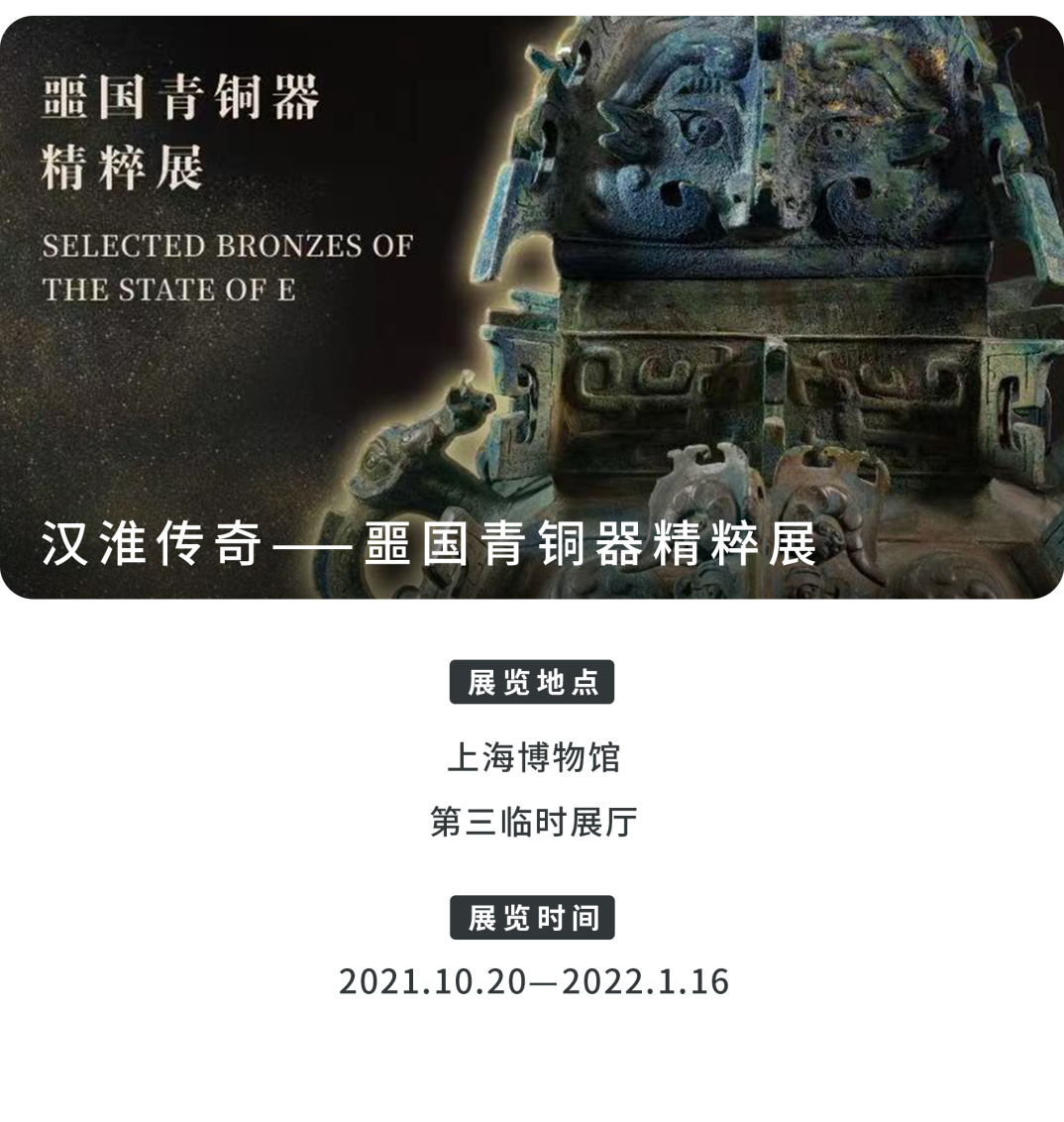 为完整呈现噩国青铜器的发展脉络,并为观众还原噩国的历史面貌,上海博物馆特此举办“汉淮传奇——噩国青铜器精粹展”。本展览将会持续到2022年1月16日。