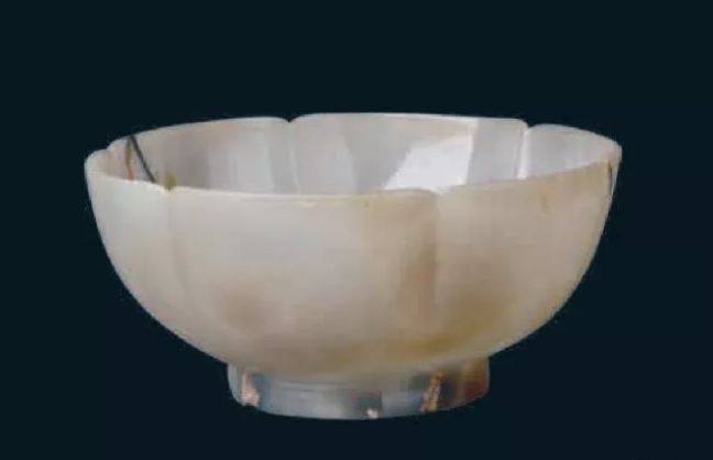 四类为西亚文化特色的玉器,如四曲海棠花式杯、孔雀十六曲刻饰水波纹玉碗、白玉花式碗。