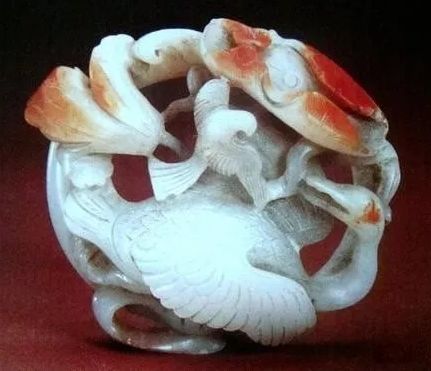 二类为中原汉文化的玉器,如玉带板、玉杯、玉盒、玉砚、玉水盂、玉碗,以及植物花卉飞禽走兽中的凌霄花、荷莲、龙凤、绶带鸟、鸳鸯、蝴蝶、兔子、乌龟、鳜鱼等纹饰造型;