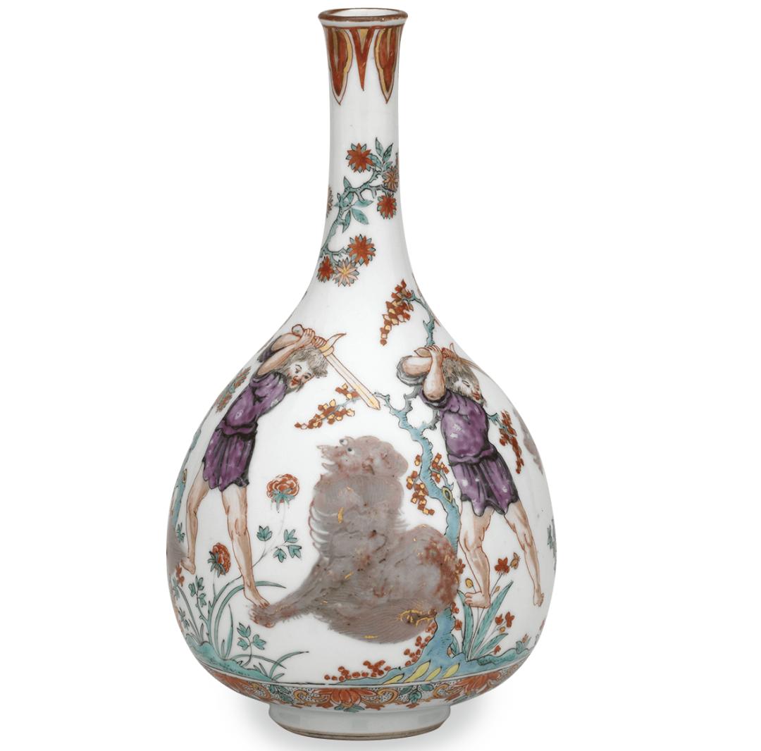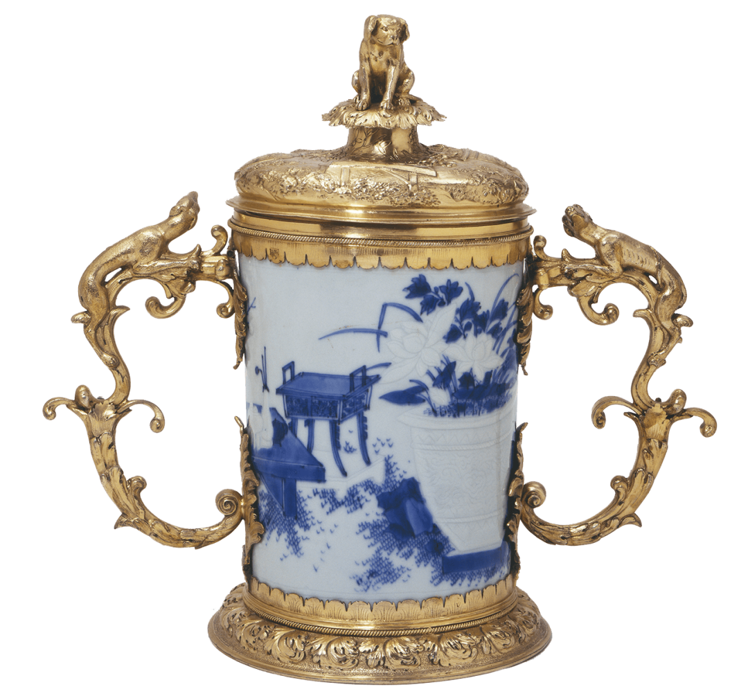东西方的装饰传统、审美趣味并不相同,中国瓷器有时会被欧洲工匠重新装饰、镶嵌,这是一场极富创意的视觉改造游戏:景德镇的釉里红瓷器被荷兰工匠添上日本风格的纹样,盛放毛笔的笔筒被改装成盖杯,中西技艺在此碰撞、交融,绽放出独特想象力与美感。