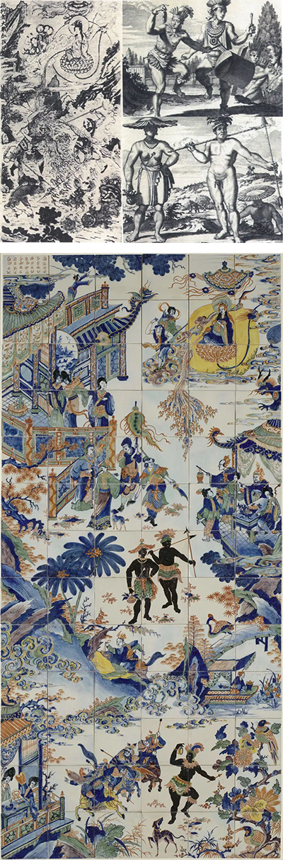在渴望异国情调的欧洲人眼中,瓷器的魅力也来源于它的产地——因《马可·波罗游记》而闻名的中国,欧洲人将中国想象成奇妙的国度。十七世纪后半,一系列东方见闻录的出版助推了“中国风尚”潮流,瓷器中的图像展现出西方理解与遐想中的中国世界,融合中国和美洲人形象的代尔夫特陶砖,是欧洲人对异域想象的最佳演绎。