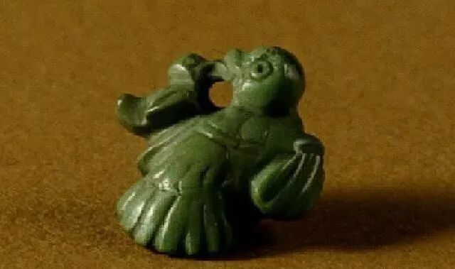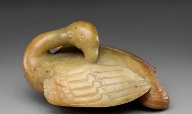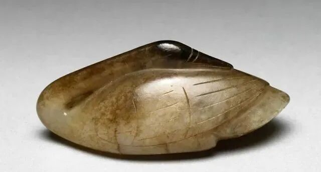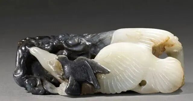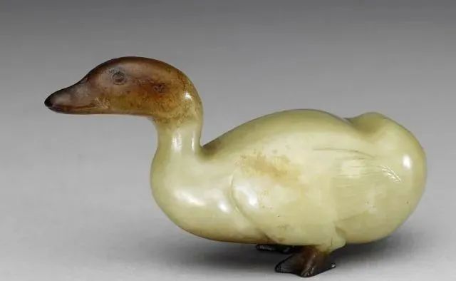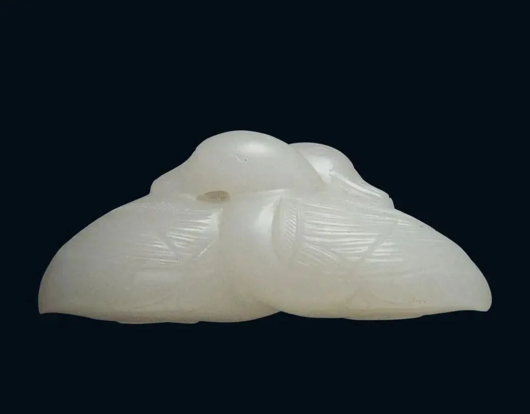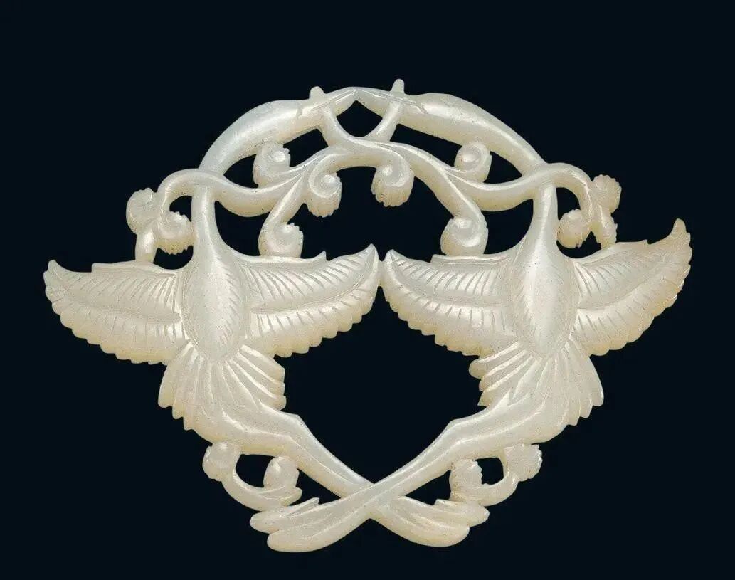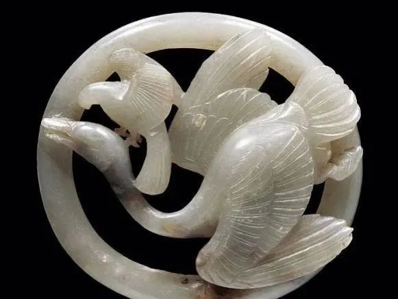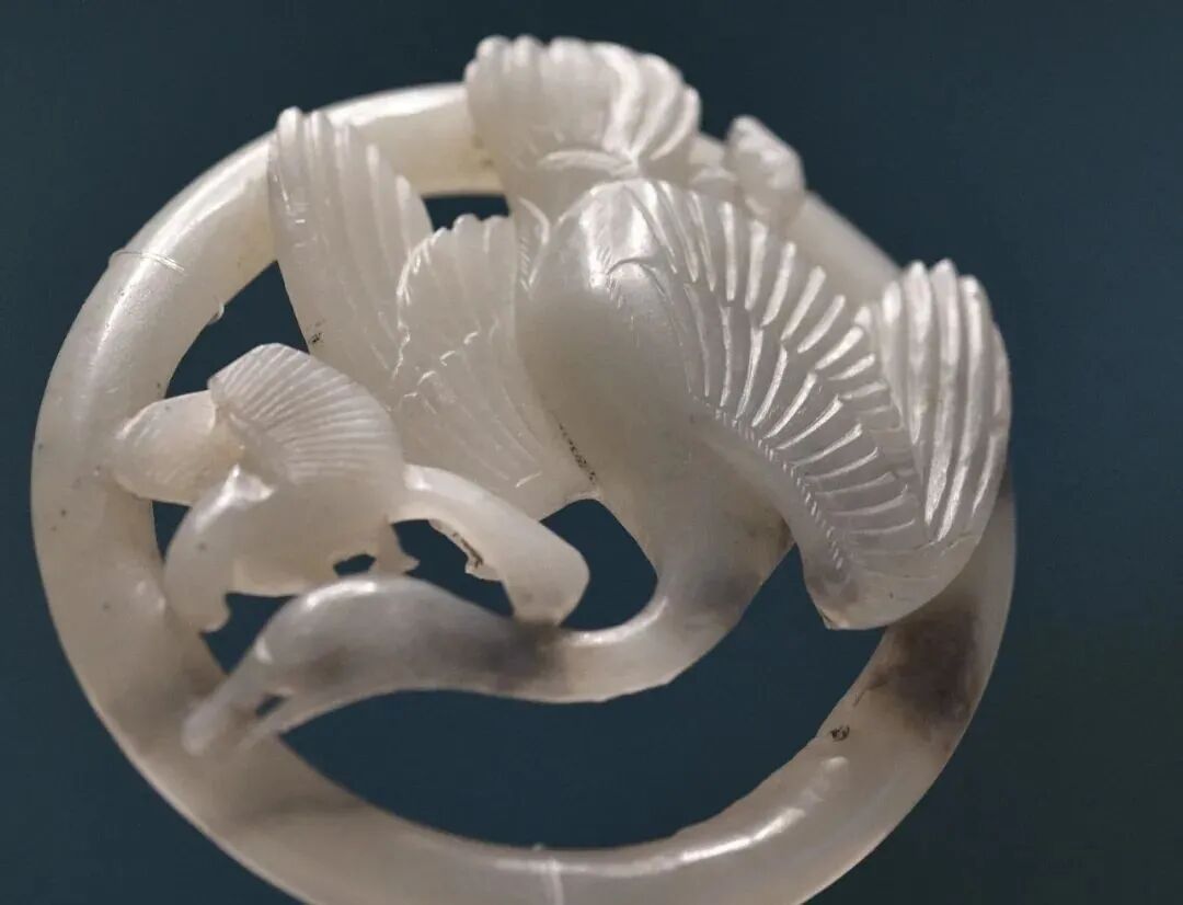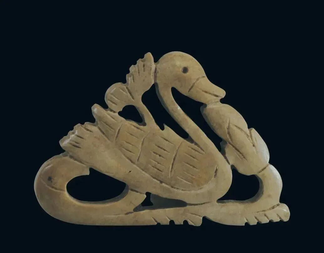 玉质青色。圆形环托,正面雕鹘攫天鹅,高高凸起,立体感强。鹘、鹅的羽翼使用大量的短小阴刻线纹。器作者将鹘展翅翻腾攫啄天鹅时凶猛的瞬间动态及天鹅被抓时引颈悲鸣的细微刻画都表现得淋漓尽致,堪称这类“春水”题材中的精品。 鹘(hú),即隼(sn),又名海东青。叶隆礼《契丹国志》记载:“女真东北与五国为邻,五国之东邻大海,出名鹰,自海东来者,谓之海东青,小而健,能擒鹅鹜,爪白者尤为异,辽人酷爱之,岁岁求之女真,女真至五国,战斗而后得,女真不胜其扰。” “鹘啄鹅”就是“春水玉”常见的呈现主题。1139年,金熙宗下诏说:“自今四时游猎,春水秋山,冬夏捺钵,并循辽人故事”。春捺钵即“春水”,是指用鹰鹘[g](海东青)捕获天鹅、大雁的狩猎活动,其玉雕作品称为“春水玉”,金代春水玉是写实的。![]()