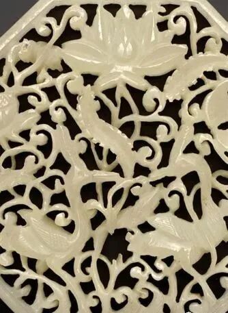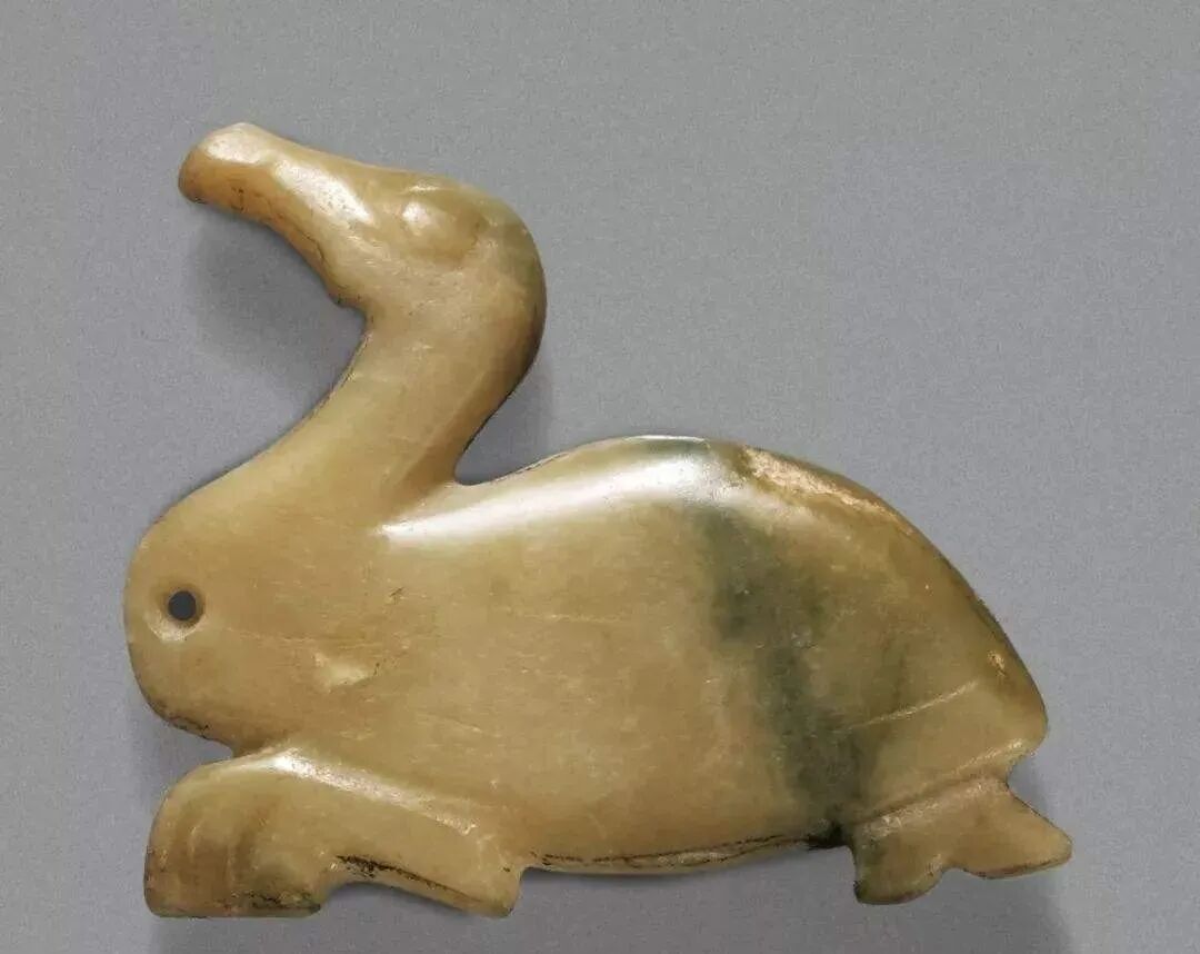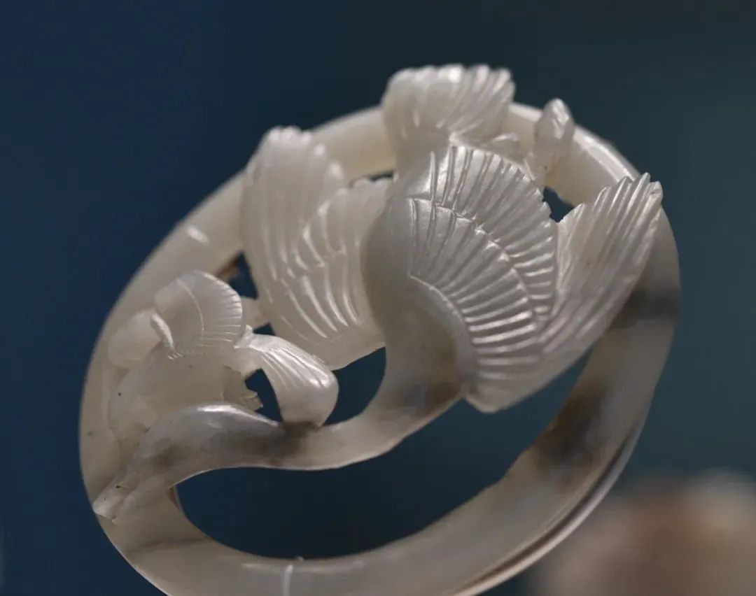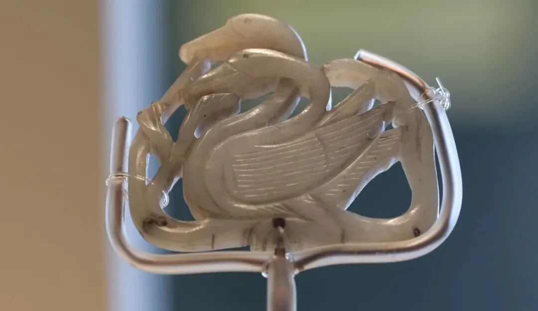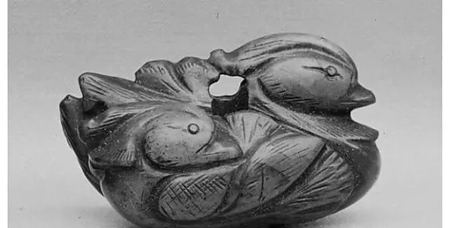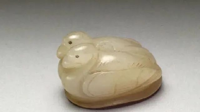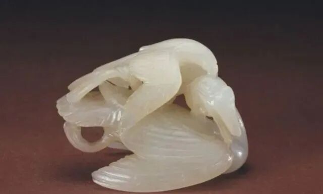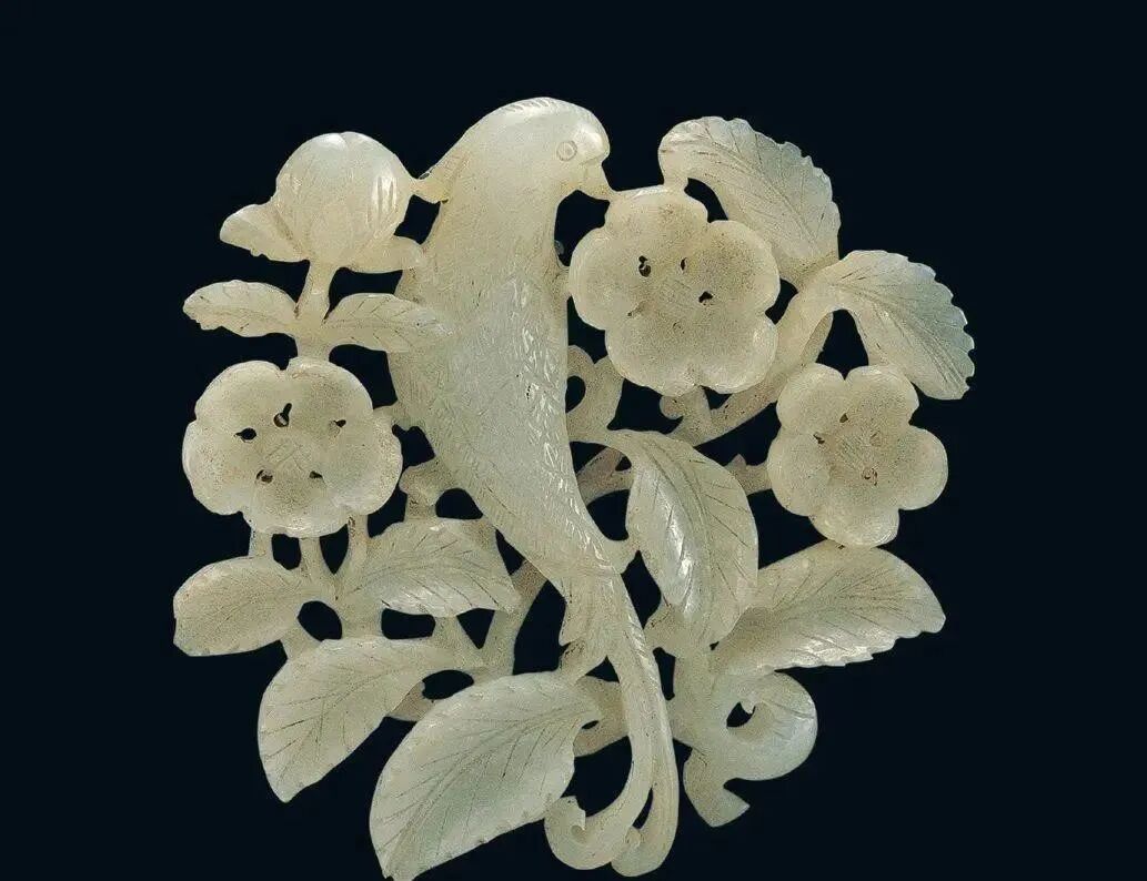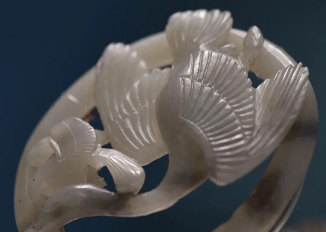 玉质青色。圆形环托,正面雕鹘攫天鹅,高高凸起,立体感强。鹘、鹅的羽翼使用大量的短小阴刻线纹。器作者将鹘展翅翻腾攫啄天鹅时凶猛的瞬间动态及天鹅被抓时引颈悲鸣的细微刻画都表现得淋漓尽致,堪称这类“春水”题材中的精品。 鹘(hú),即隼(sn),又名海东青。叶隆礼《契丹国志》记载:“女真东北与五国为邻,五国之东邻大海,出名鹰,自海东来者,谓之海东青,小而健,能擒鹅鹜,爪白者尤为异,辽人酷爱之,岁岁求之女真,女真至五国,战斗而后得,女真不胜其扰。” “鹘啄鹅”就是“春水玉”常见的呈现主题。1139年,金熙宗下诏说:“自今四时游猎,春水秋山,冬夏捺钵,并循辽人故事”。春捺钵即“春水”,是指用鹰鹘[g](海东青)捕获天鹅、大雁的狩猎活动,其玉雕作品称为“春水玉”,金代春水玉是写实的。![]()