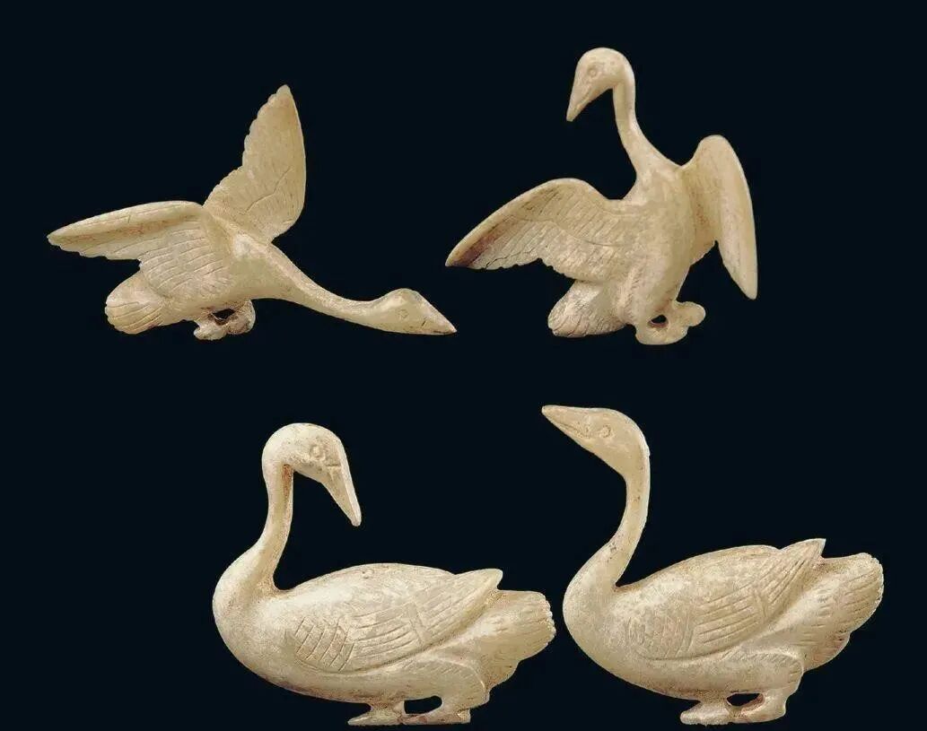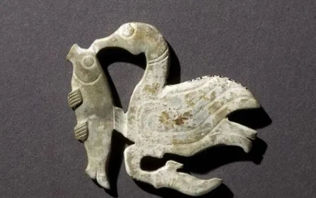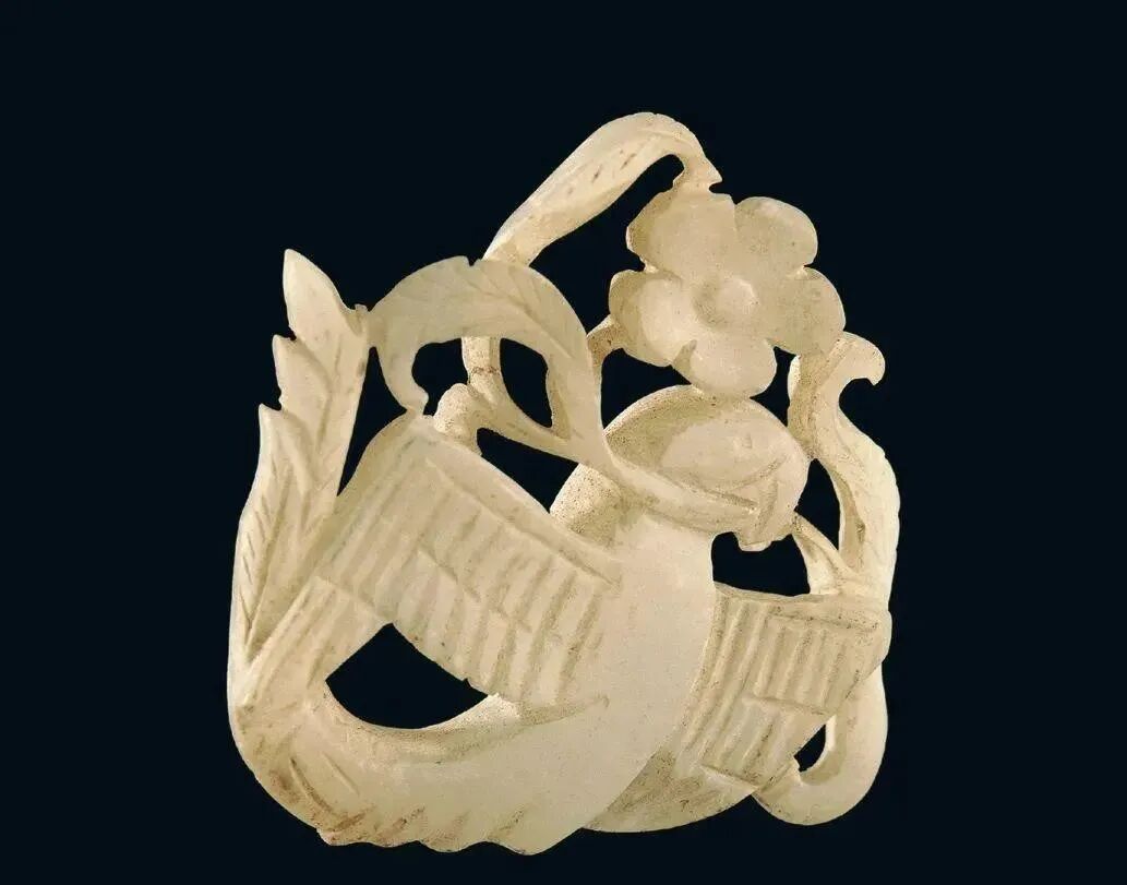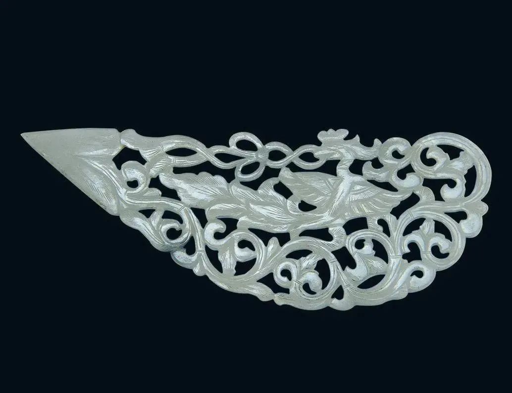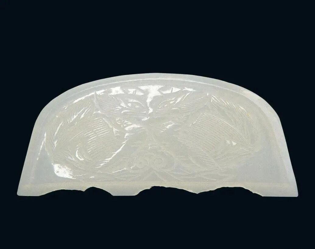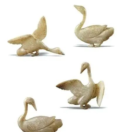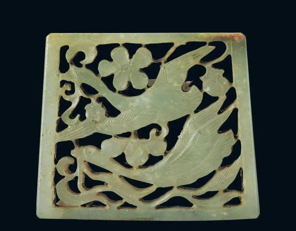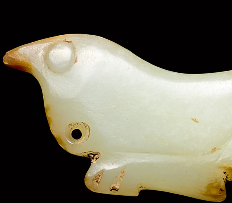 玉质青色。圆形环托,正面雕鹘攫天鹅,高高凸起,立体感强。鹘、鹅的羽翼使用大量的短小阴刻线纹。器作者将鹘展翅翻腾攫啄天鹅时凶猛的瞬间动态及天鹅被抓时引颈悲鸣的细微刻画都表现得淋漓尽致,堪称这类“春水”题材中的精品。 鹘(hú),即隼(sn),又名海东青。叶隆礼《契丹国志》记载:“女真东北与五国为邻,五国之东邻大海,出名鹰,自海东来者,谓之海东青,小而健,能擒鹅鹜,爪白者尤为异,辽人酷爱之,岁岁求之女真,女真至五国,战斗而后得,女真不胜其扰。” “鹘啄鹅”就是“春水玉”常见的呈现主题。1139年,金熙宗下诏说:“自今四时游猎,春水秋山,冬夏捺钵,并循辽人故事”。春捺钵即“春水”,是指用鹰鹘[g](海东青)捕获天鹅、大雁的狩猎活动,其玉雕作品称为“春水玉”,金代春水玉是写实的。![]()