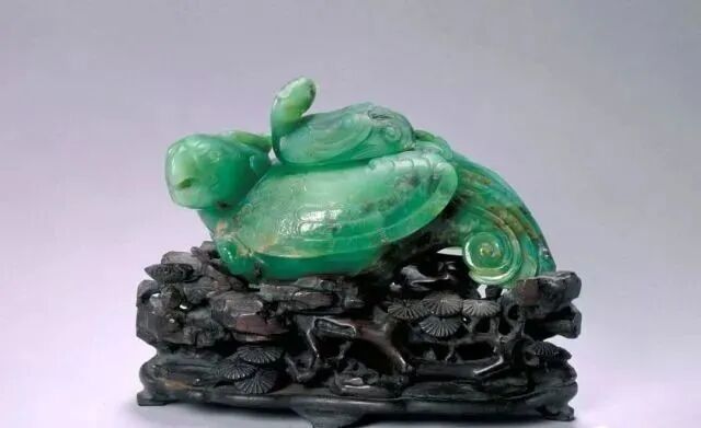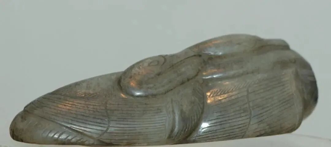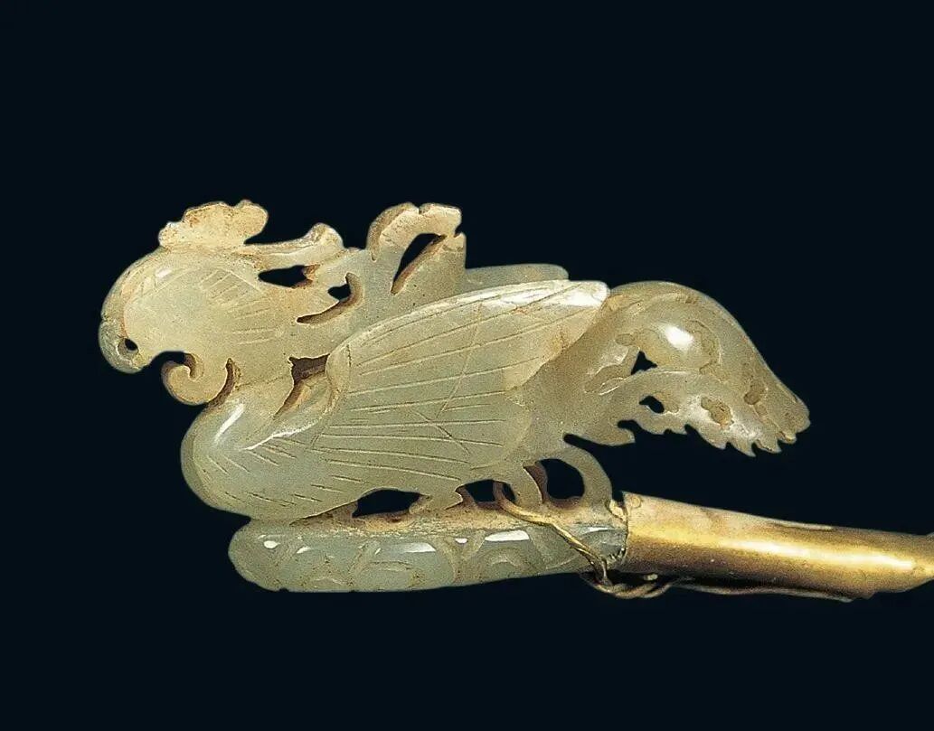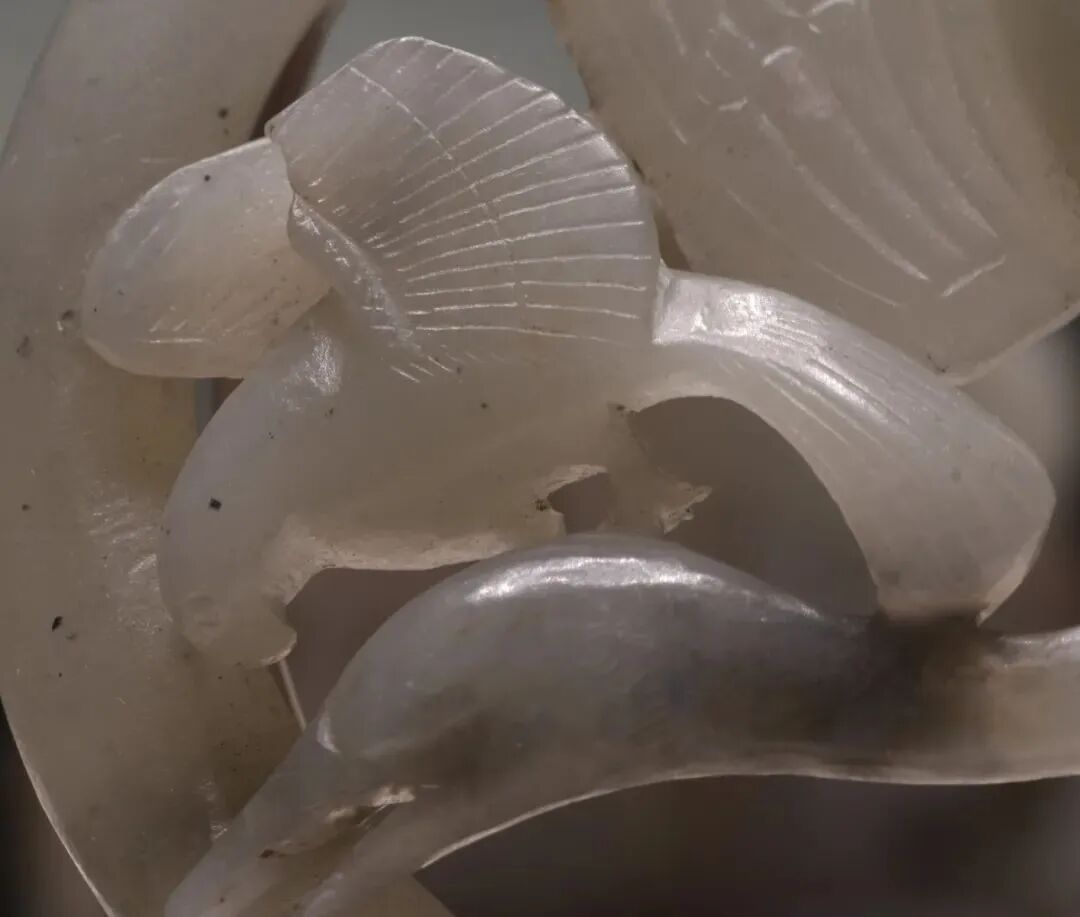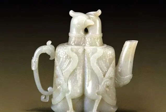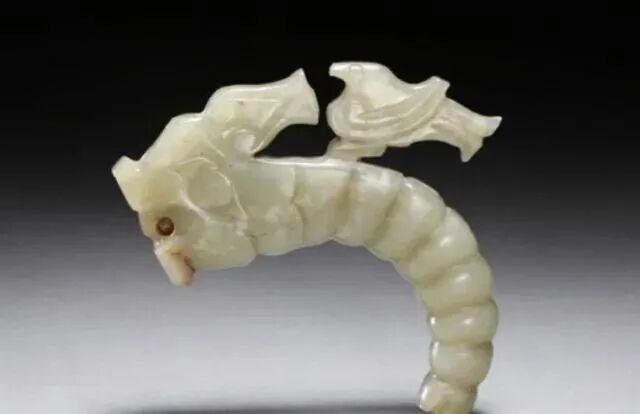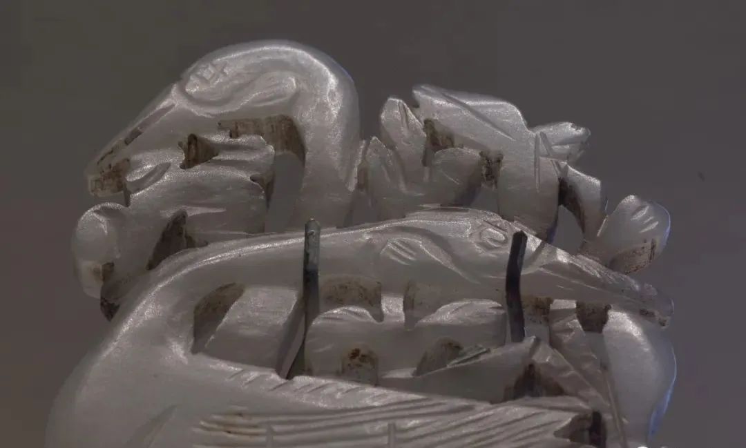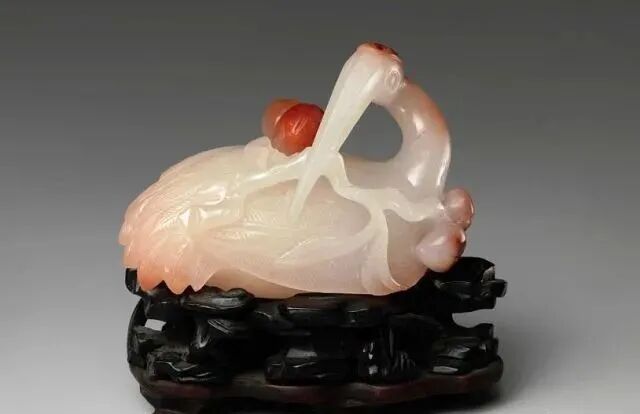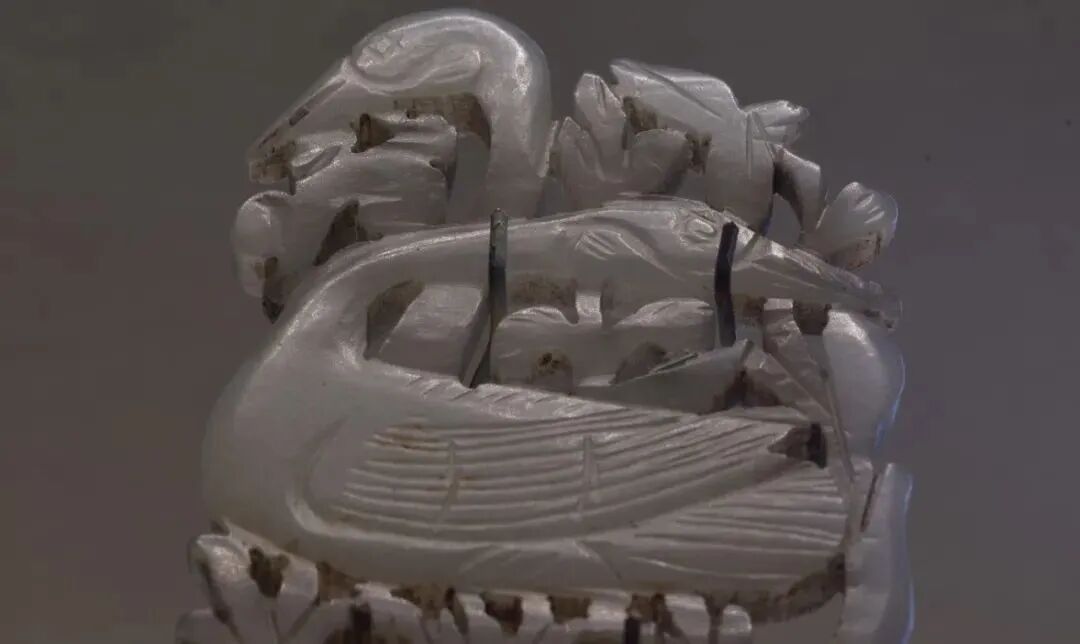 玉质青色。圆形环托,正面雕鹘攫天鹅,高高凸起,立体感强。鹘、鹅的羽翼使用大量的短小阴刻线纹。器作者将鹘展翅翻腾攫啄天鹅时凶猛的瞬间动态及天鹅被抓时引颈悲鸣的细微刻画都表现得淋漓尽致,堪称这类“春水”题材中的精品。 鹘(hú),即隼(sn),又名海东青。叶隆礼《契丹国志》记载:“女真东北与五国为邻,五国之东邻大海,出名鹰,自海东来者,谓之海东青,小而健,能擒鹅鹜,爪白者尤为异,辽人酷爱之,岁岁求之女真,女真至五国,战斗而后得,女真不胜其扰。” “鹘啄鹅”就是“春水玉”常见的呈现主题。1139年,金熙宗下诏说:“自今四时游猎,春水秋山,冬夏捺钵,并循辽人故事”。春捺钵即“春水”,是指用鹰鹘[g](海东青)捕获天鹅、大雁的狩猎活动,其玉雕作品称为“春水玉”,金代春水玉是写实的。![]()
