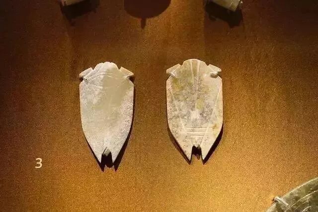 玉戈。已有青铜配件,商代玉戈和周代的玉圭已很接近,是后代尖顶玉圭的祖形。
