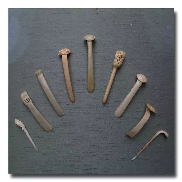 玉带头(8号)制成一株花草的形象,中间有狭槽可以穿腰带使用;带扣(9号)分为两部分,刻有龙腾云间的图案。