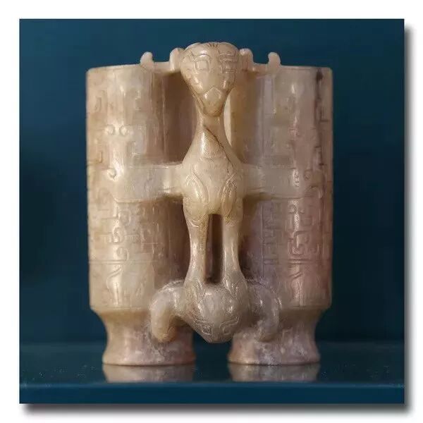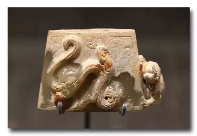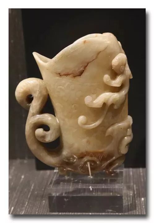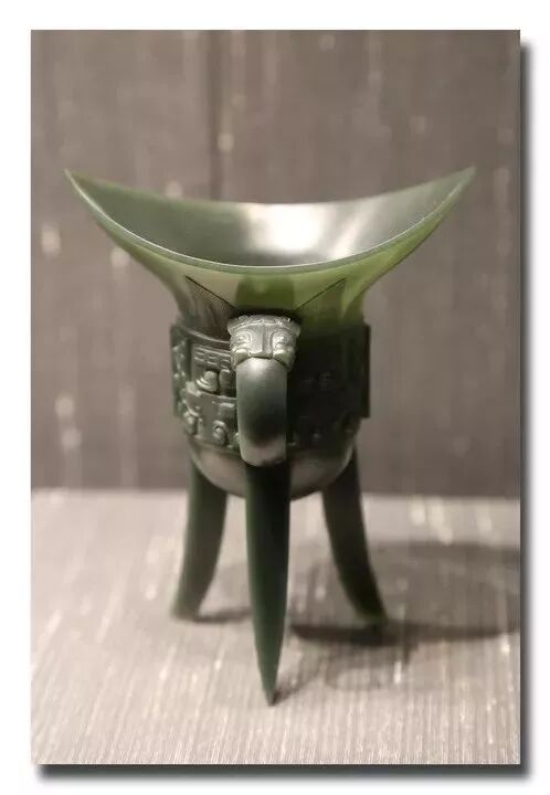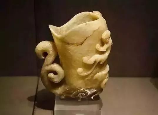汉朝时期,中国的宫廷之上十分流行中亚的奢侈品,这种角形造型就是在当时被引进中国的。而杯子上龙头吞杯的样式则可能是后来的发明或者仿古而成。