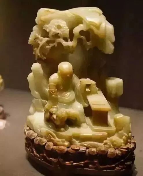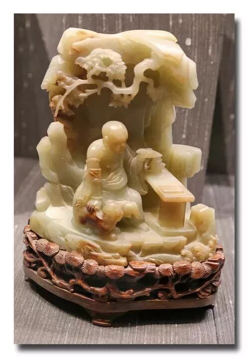 这是一件装饰性玉雕,玉雕图案受到木版画的启发,表现了第五罗汉(佛陀的弟子)坐在岩石间的样子。