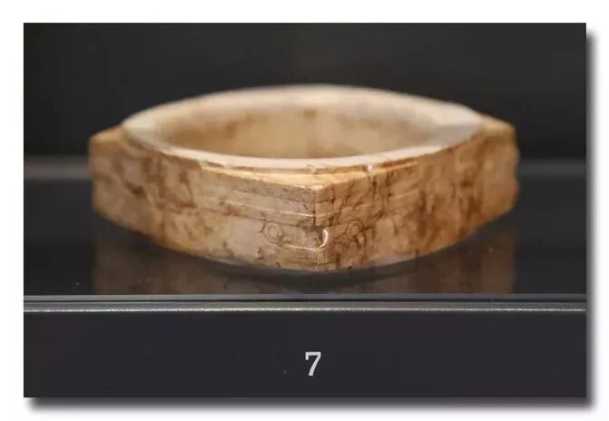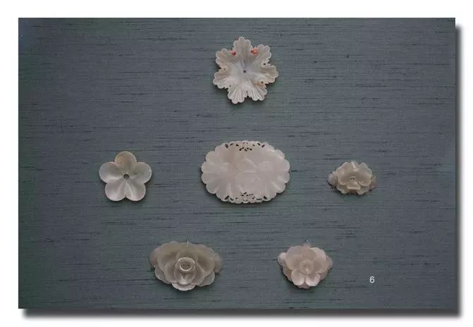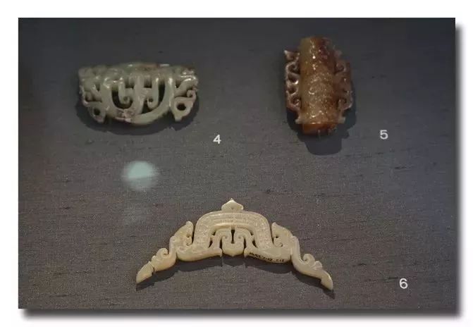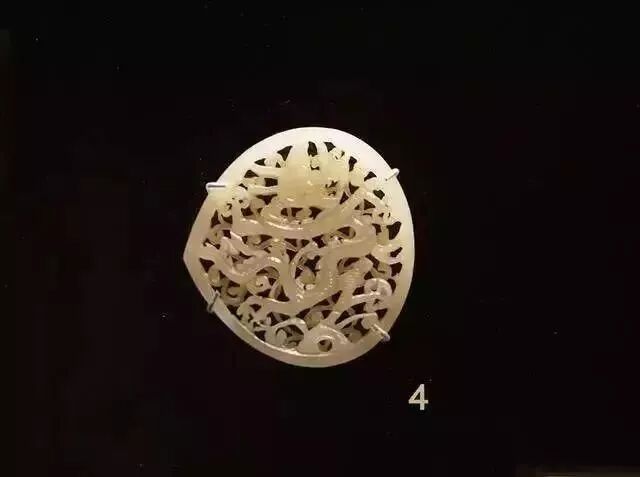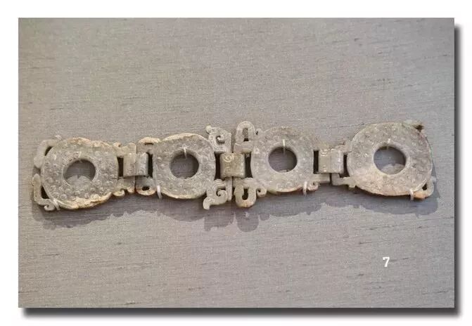 4号玉璧由玻璃制成。早期的中国玻璃十分有特色,有着与玉相近的质感。通常那些买不起玉却坚信与玉类似的材料可以起到相同身心保护作用的人会用玻璃。5号玉璧上刻有鸟的图案,而6号玉璧则有四个兽头,外圈围绕着交织缠绕的卷纹。5、6号玉璧的中央部分都有十字纹图案覆盖,当玉璧移动时,这个部位光线闪烁。