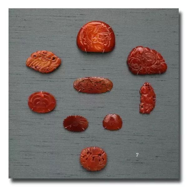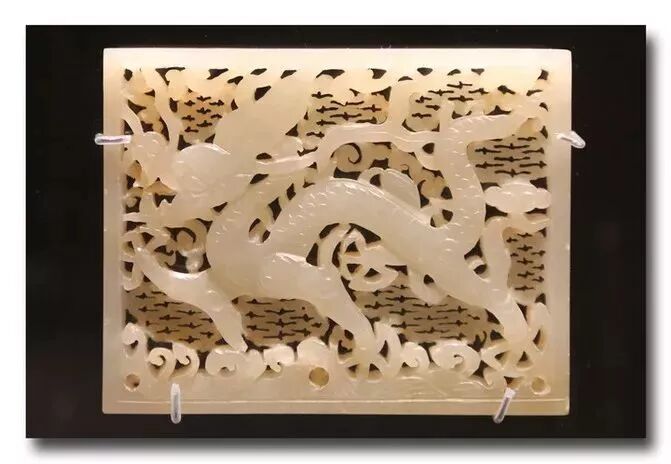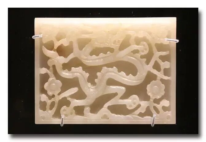 这里展示的大部分玉带板都于明朝制作,时间在14-17世纪之间。1号是时间最早的一块,制作于唐代,可以追溯到8世纪,刻画的是一个亚洲乐师吹笛子的形象。音乐和舞蹈是唐朝宫廷生活很重要的一部分,许多饰带组在每一块上都会刻画一个不同的异域乐师和乐器。2号展示了一头狮子在追逐绣球的图案。许多玉带板还会描绘龙飞腾在云间或者草木中的形象。6号就展示了一条龙正在飞跃一座海浪间的小岛山时的情形。