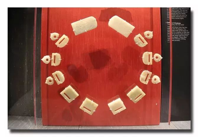 眼前的这组玉带由两块铊尾、四块正方形带板及十二块稍小的带板组成。带板前面富有光泽,后面则无光。所有的带板在后面都有小孔,可穿入皮带或者布带。像刀一类必要的物件则挂在两条穿在带板狭缝间的带子上。这个部分很重要,因为古代中国的服装上没有口袋。