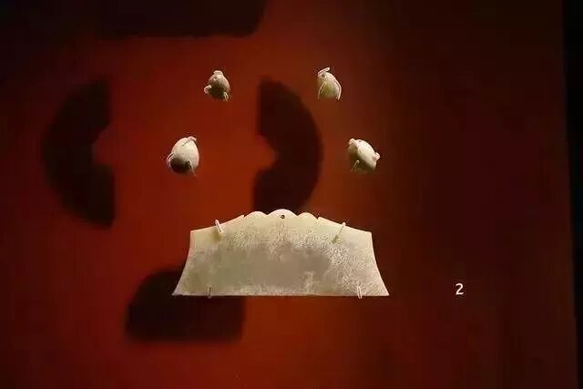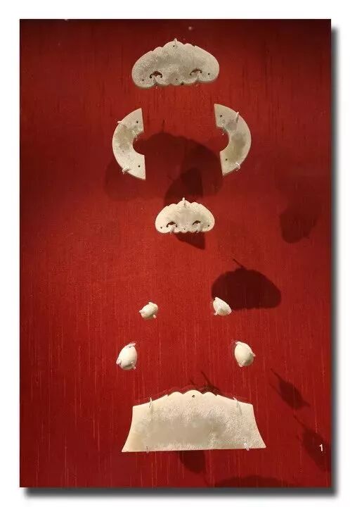 这组垂饰包括两个云形饰物,两个弧形(璜)饰物及四个珠子。类此的组垂饰可以很清晰地在唐朝壁画中的人物身上看到。