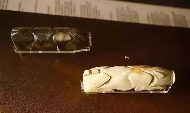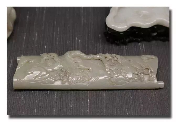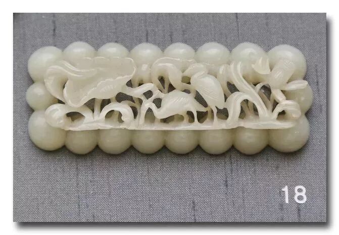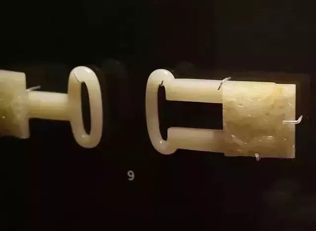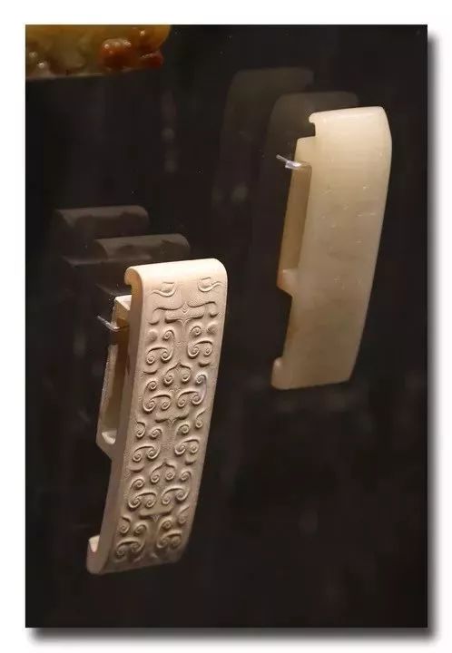 剑璏,剑鞘上的玉带扣,可穿系于腰带上,将剑固定于腰间。前面一个入土后遇石灰沁,呈乳白色。不透明,但有历史的厚重感。