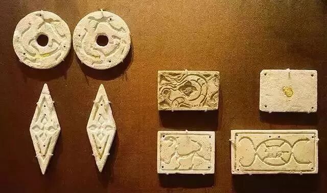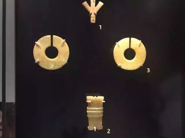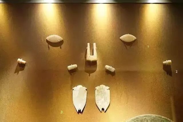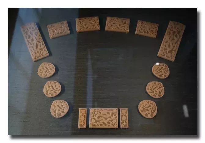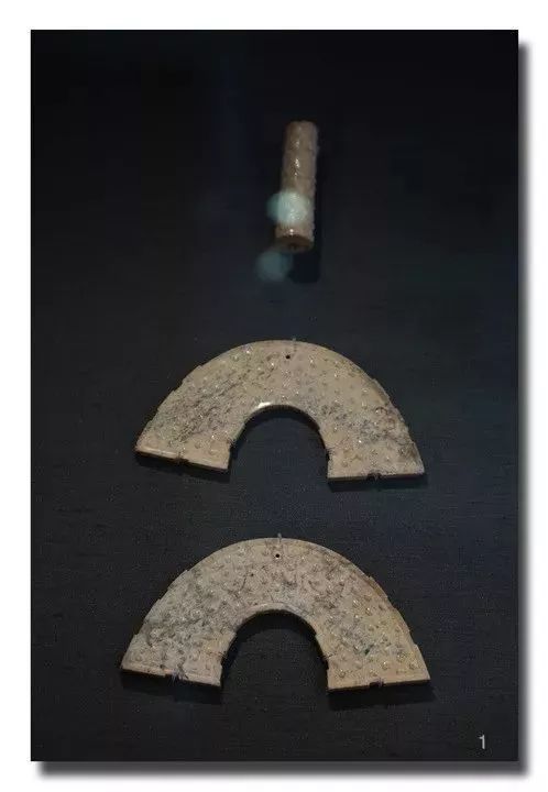 这个隆起的圆形饰板下有一个青铜镀金底座(1号),上面刻有一条龙及类似老虎的生物形象。这个饰板可能曾经被固定在某些如今已经消失的有机物或者金属制品上。2号和3号都形似一张面孔,一个是长角怪兽脸,另一个是类似老虎的脸。