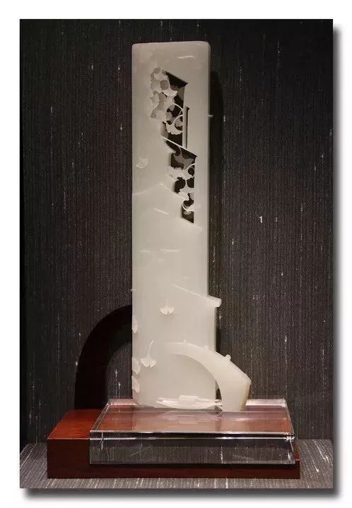 银杏落叶,金黄一片,让你生出许多想象。设计感很强,是现代作品。从构图到雕工,现代意味很浓。