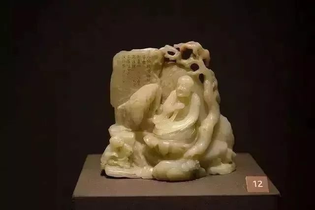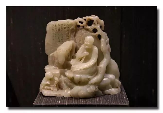 该玉雕表现了第九罗汉坐于石间的样子。人物形象刻画逼真,玉雕上写有汉字。