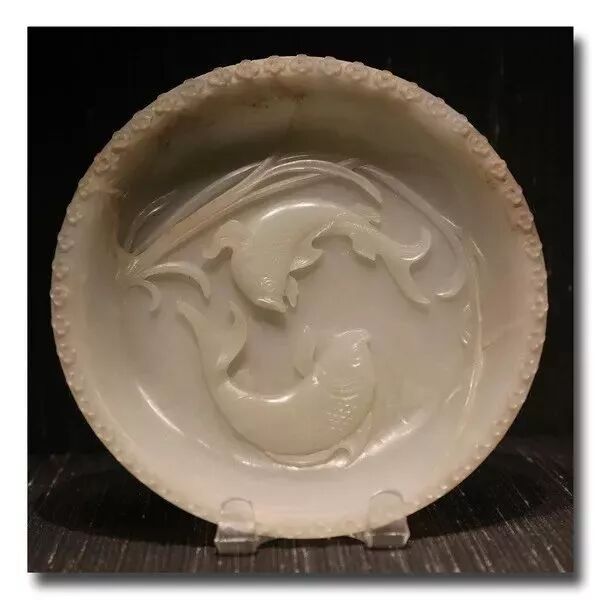 鸟、鱼戏水的场景图案常常出现在明后期的器具上。该玉盘上刻有双鱼嬉戏于芦苇丛中的场景图案。