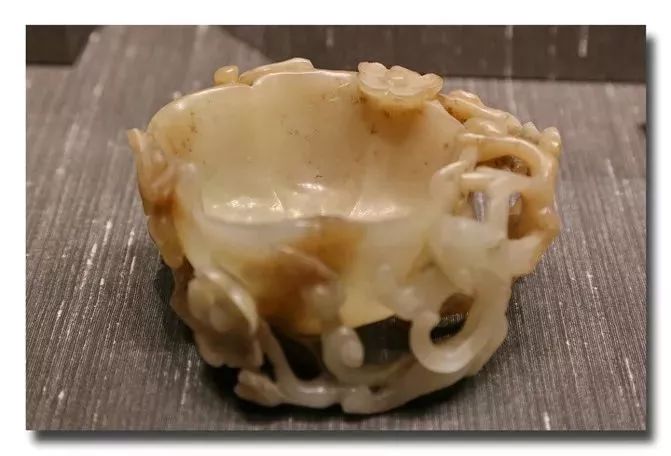 该玉杯形状受到黄金或银质容器的影响,杯身为叶瓣形状,底部刻有一个汉字。