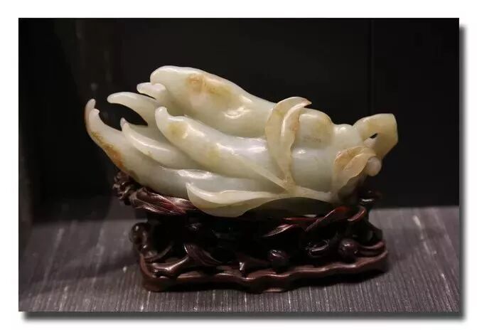 玉花插,虽然已不是普通花插那样的实用器,但毕竟还是花插。似乎应该竖起来放才对。北京故宫中的清黄玉佛手花插就是竖起来摆放的。