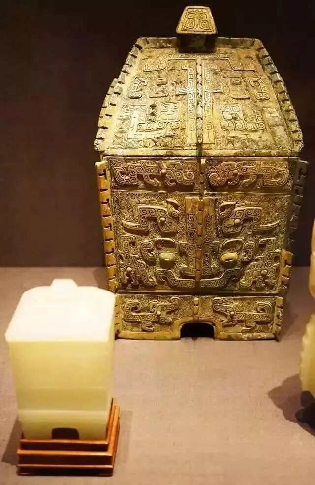 容器的形状和纹路均模仿青铜方彝而来。在清朝时期,工匠就开始用美玉雕刻此类容器。容器上有乾隆御印。