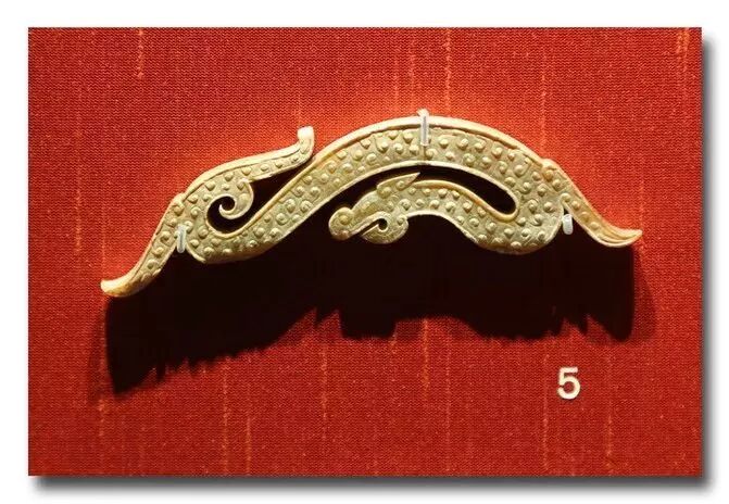 该头饰表现了一条盘龙的形象,龙爪紧紧扣住一颗珍珠。许多类似的装饰后来都被改做成青铜器皿的盖钮。