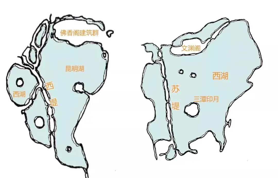 ▼颐和园(左)与杭州西湖(右)平面对比