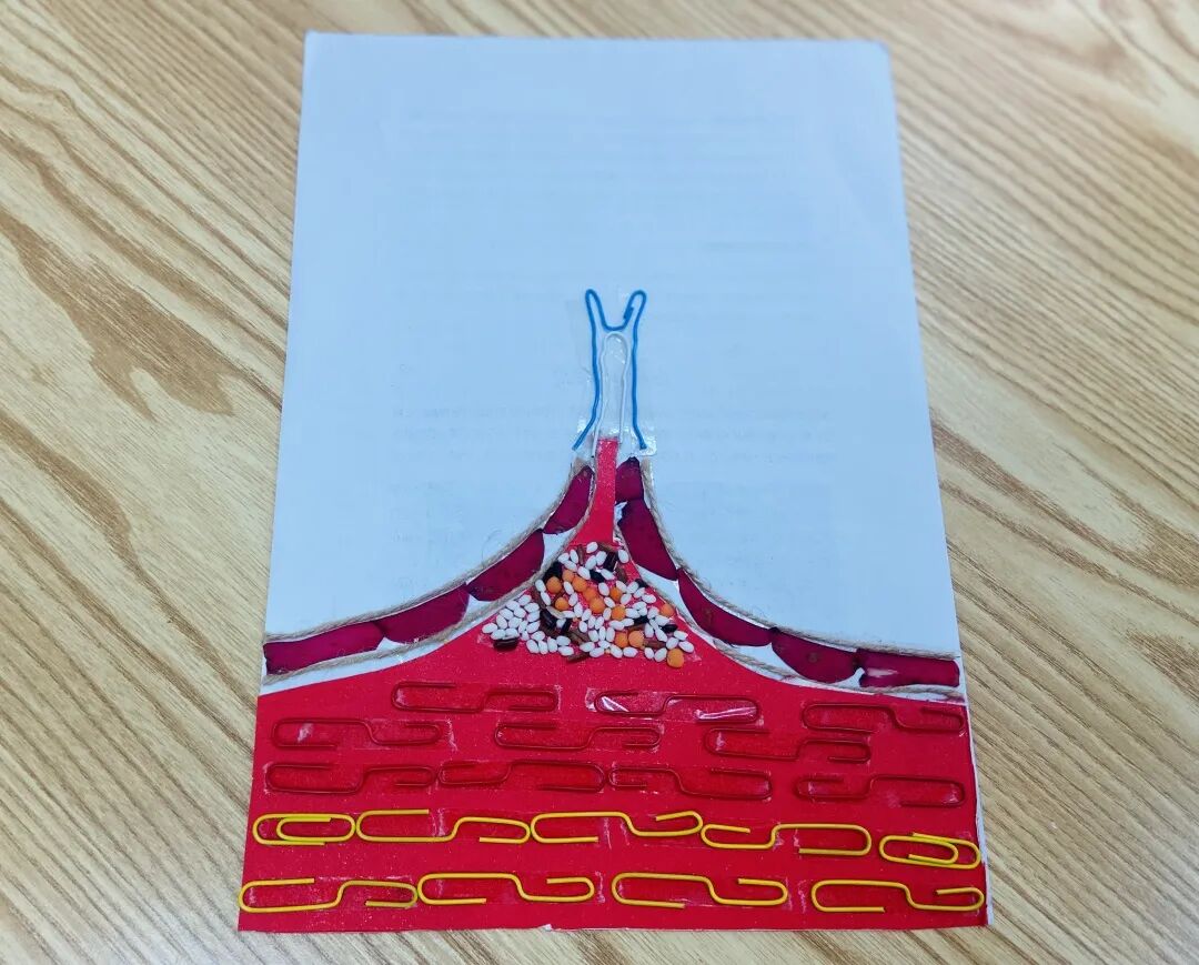 图1为:讲师用回形针、麻绳、玫瑰花瓣、腊八粥的米、红色硬纸壳制作的“泉州燕尾脊”;