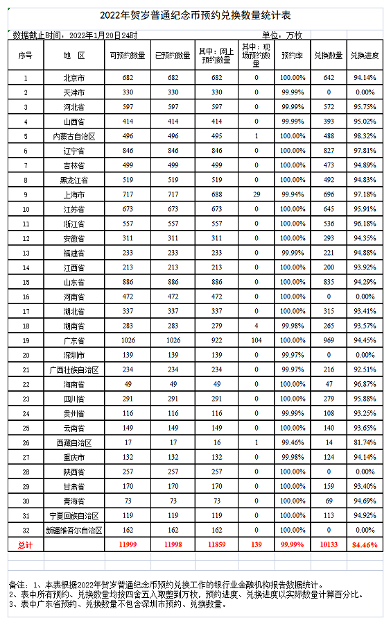 央行公布虎年纪念币最终兑换进度,时间截止到1月20号24时: