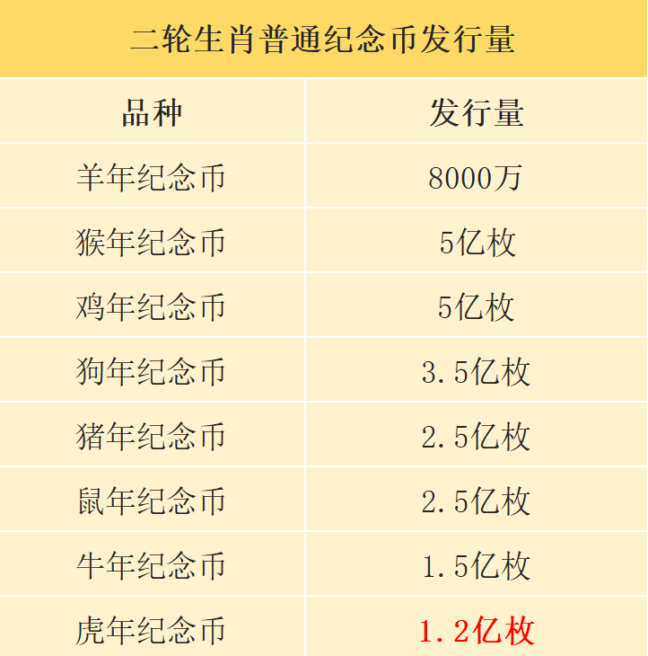 从二轮狗年纪念币开始,央行发行的生肖币不断减少,从3.5亿到虎币1.2亿,估计兔年纪念币的发行量也不会太多,1.2亿-1.5亿之间吧。