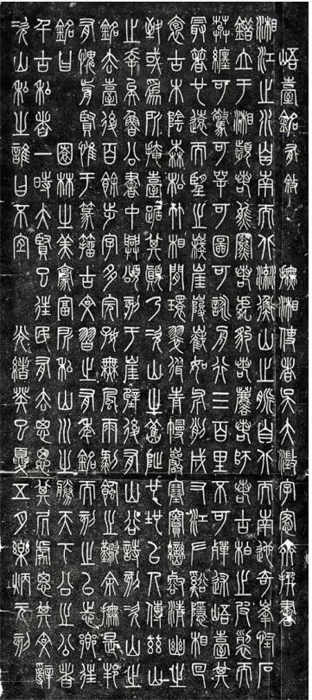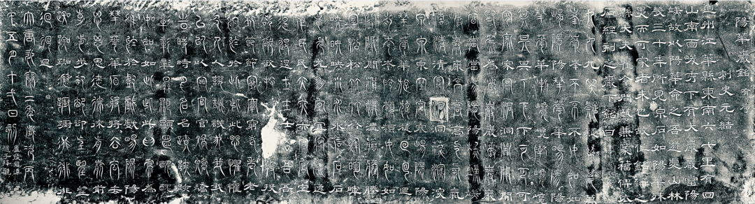 阳华岩是永州的风景名胜,为全国重点文物保护单位。如铭中所见,作者元结认为“九疑万峰,不如阳华”。原刻于唐永泰二年的《阳华岩铭》是此地摩崖石刻的开山之作。瞿令问是唐代宗时的江华县令,颇具书名。叶昌炽《语石》中言:“《阳华岩铭》,亦(瞿)令问三体篆,(李)阳冰之亚也。”书作模仿曹魏正始《石经》体例,每一字都以先大篆、次小篆、再隶书的方式书刻,是唐代书法中的重要组成部分,从中可见唐人对篆隶的理解与运用。全祖望《鲒埼亭集》中曾评价此拓“是刻亦为金石家所稀有足珍也”。