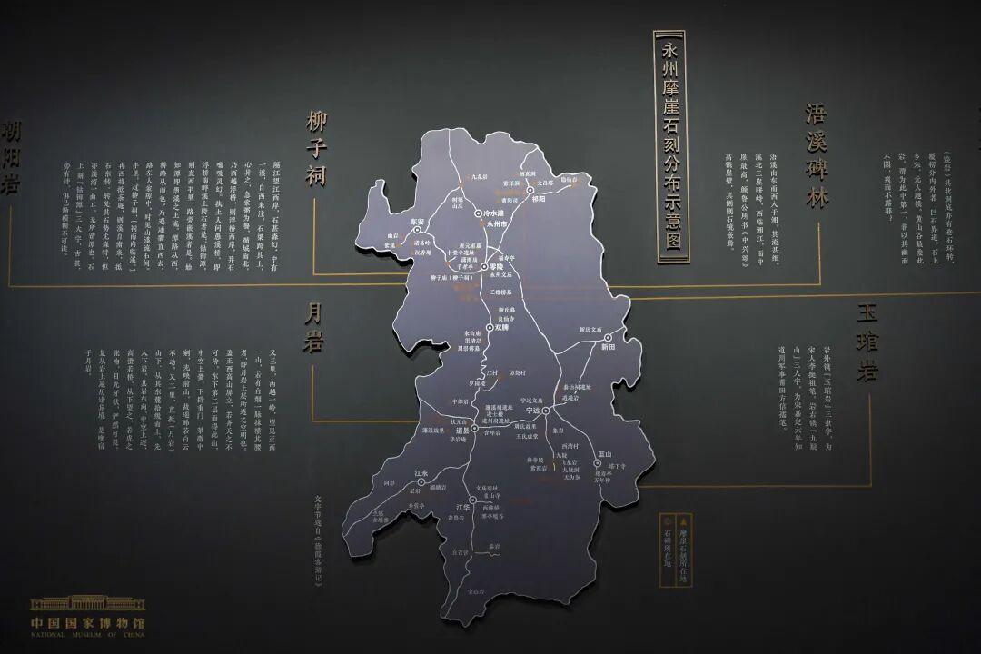 展览以永州地区的摩崖石刻为主题,结合永州的自然环境和人文特色,分为“民安国定,摩崖颂中兴”和“地缘人彰,山水绿潇湘”两个部分。