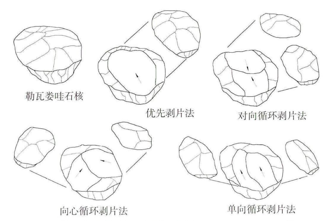 根据剥片方式的不同,学者们还将勒瓦娄哇技术细分出不同的剥片方法,循环剥片法就是其中的一种,可以在预制好的勒瓦娄哇石核上连续剥取多件石片或石叶。