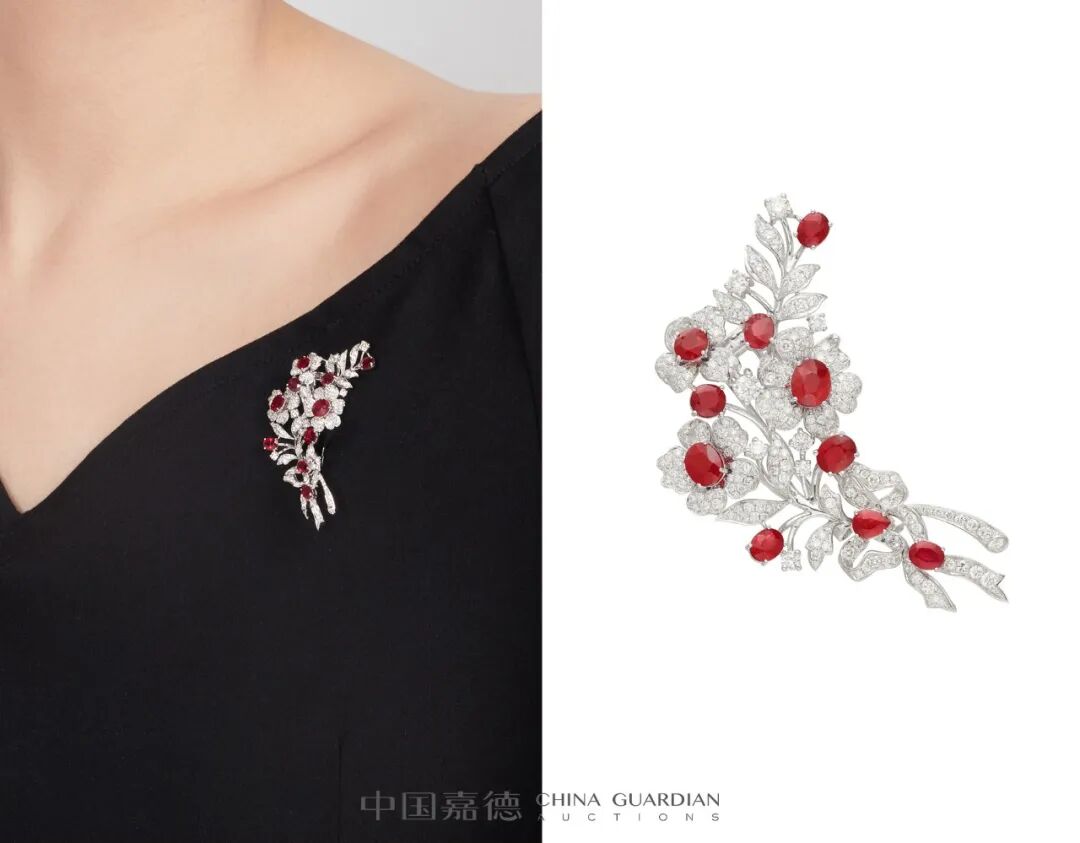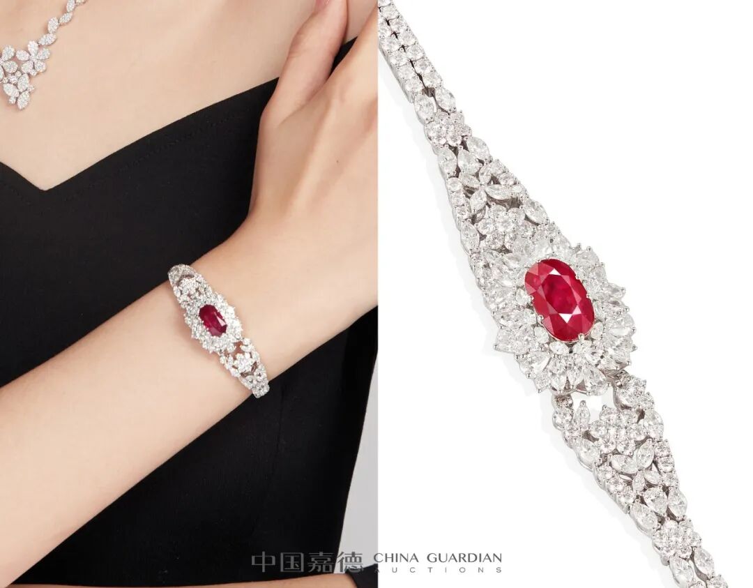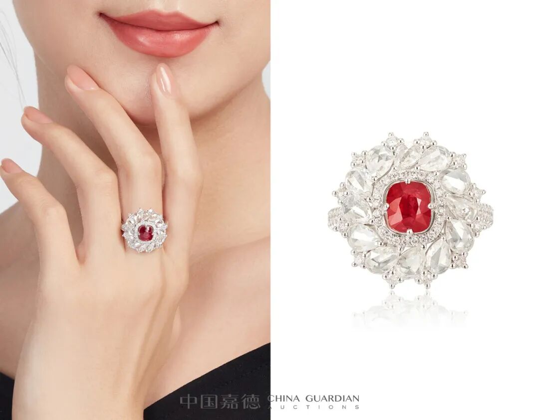 中国嘉德这季新春网拍,很荣幸能够寻获到一件大拍级别的珍罕天然缅甸抹谷红宝石珠宝,lot11574作品的主石未经加热优化,天然包裹体成为这颗宝石独一无二的身份象征,红宝石颜色浓郁深邃,荧光感极强,太阳光下耀眼夺目,并展示出正统的鸽血红色,热烈明艳,观之则浪漫喜悦感滋生。红宝石周围镶有一圈钻石,围镶钻石营造出高低错落的层次感,旖旎点缀,将主石优雅定格,富有美感。